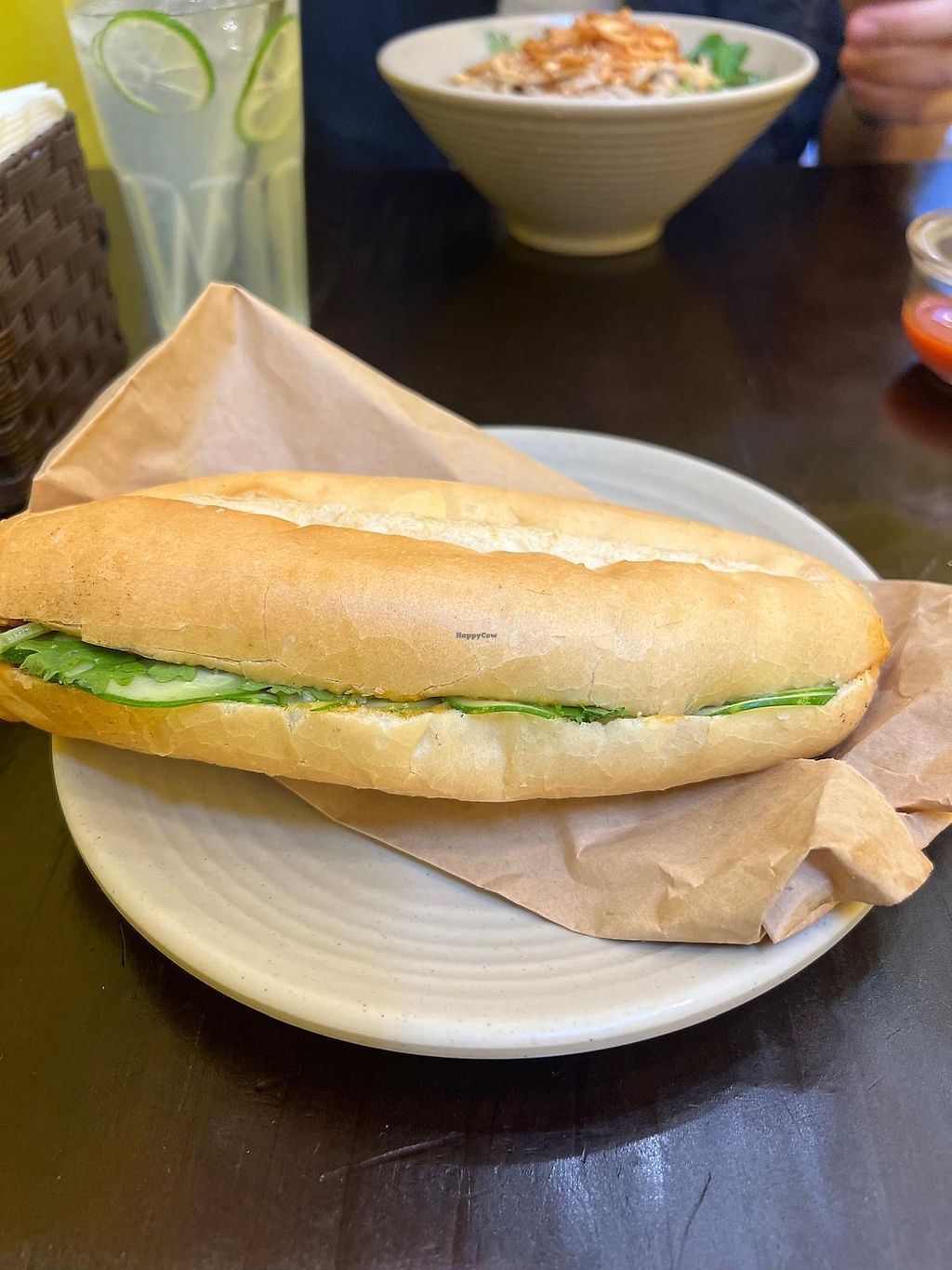 I just had an amazing meal, a Bahn mi sandwich from an incredible baguette, fried spring rolls and another dish I never had before of noodles in a slightly sour soup with yummy fried onions and tempeh - all very delicious and filling. This was easily enough food for 2 people, and the check came to $5.