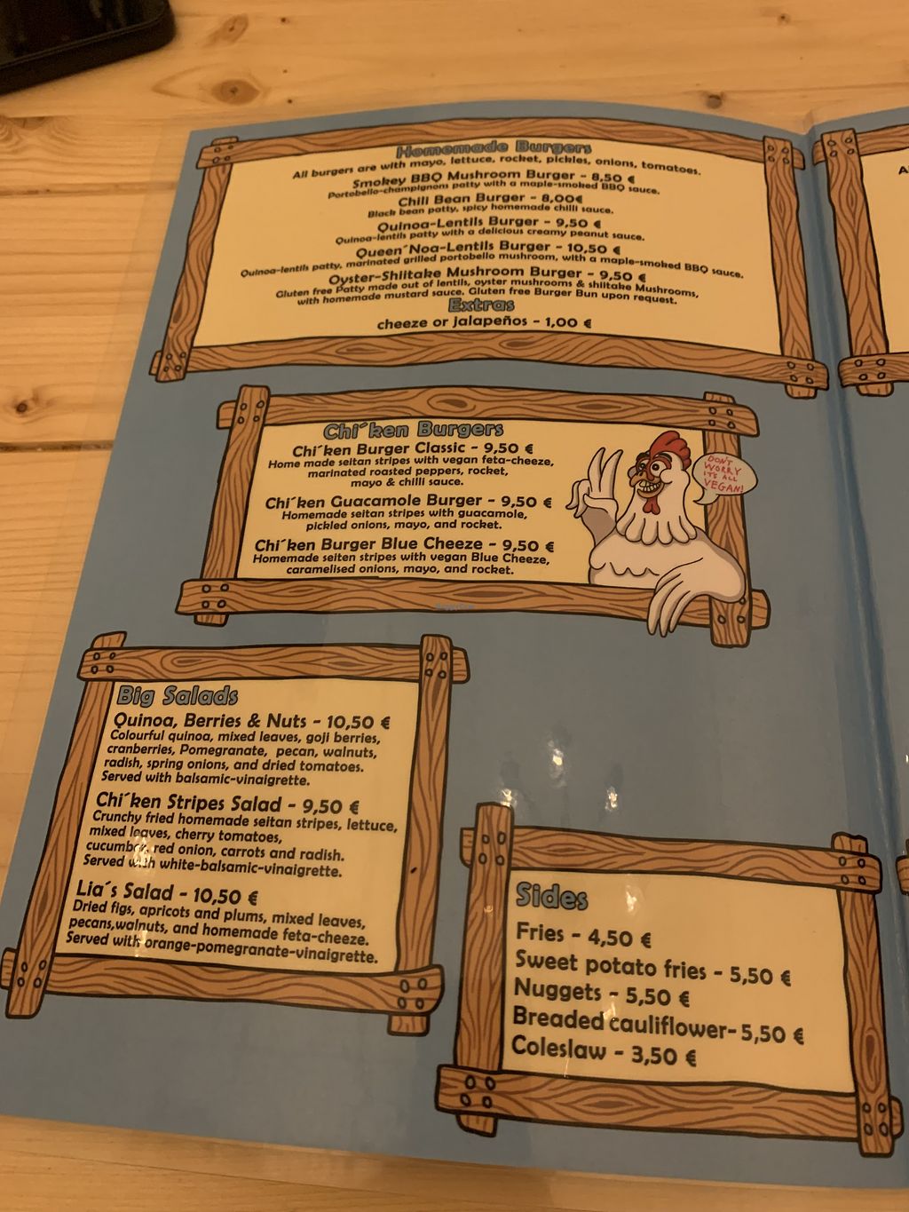 Eine kleine, aber feine Auswahl an veganen Burgern und Bowls und Beilagen. Bei uns gab es jeweils einen Burger mit Beilage. Geschmacklich absolut zu empfehlen.