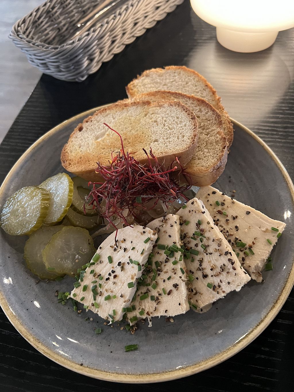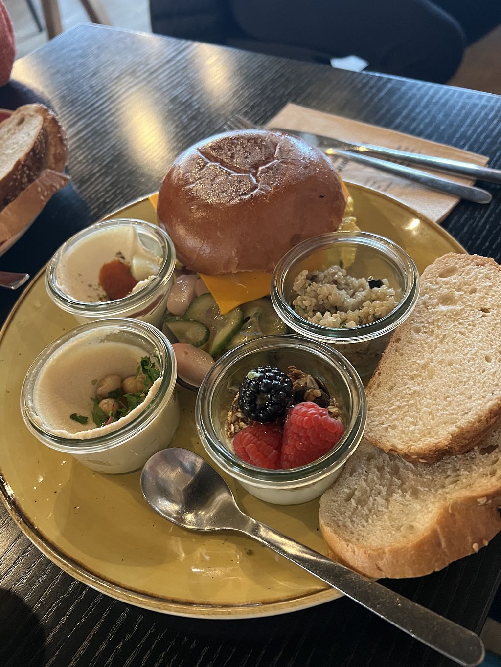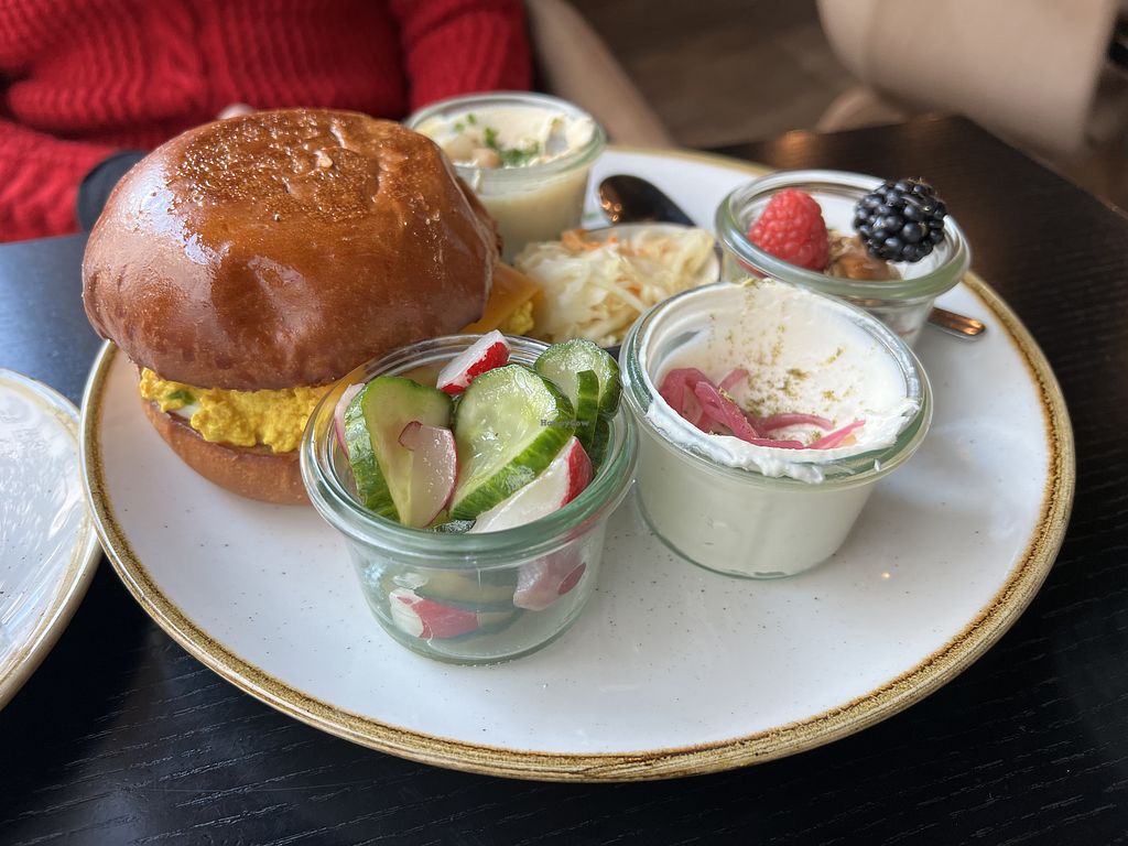 The deli is inside the Jewish museum so you have to pass the scanner and the super friendly security personnel. I was so surprised that the prices were, in contrast to that gorgeous and posh interior, super reasonable, a coffee costs 2,50 € (but ok I live in Munich) and the all-day breakfast for 12,50 € was so large and varied, there was tabouleh, hummus (found it a bit bland tbh), labaneh (phenomenal!), another cream, soy yoghurt with granola, gorgeous challa bread and of course the main dish. My shakshuka wasn't as creamy and thick as I would have expected it to be, nevertheless it was still very delicious with that crumbled silken tofu. Definitely want to come back for the joie gras and the vegan cakes!