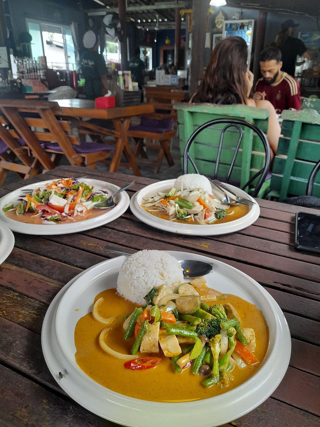 As you get the cheapest option (by not choosing the meat dishes) most of the dishes are 50 baht! Really delicious and huge portions. The papaya salad is the best I had in Thailand. They have tofu.