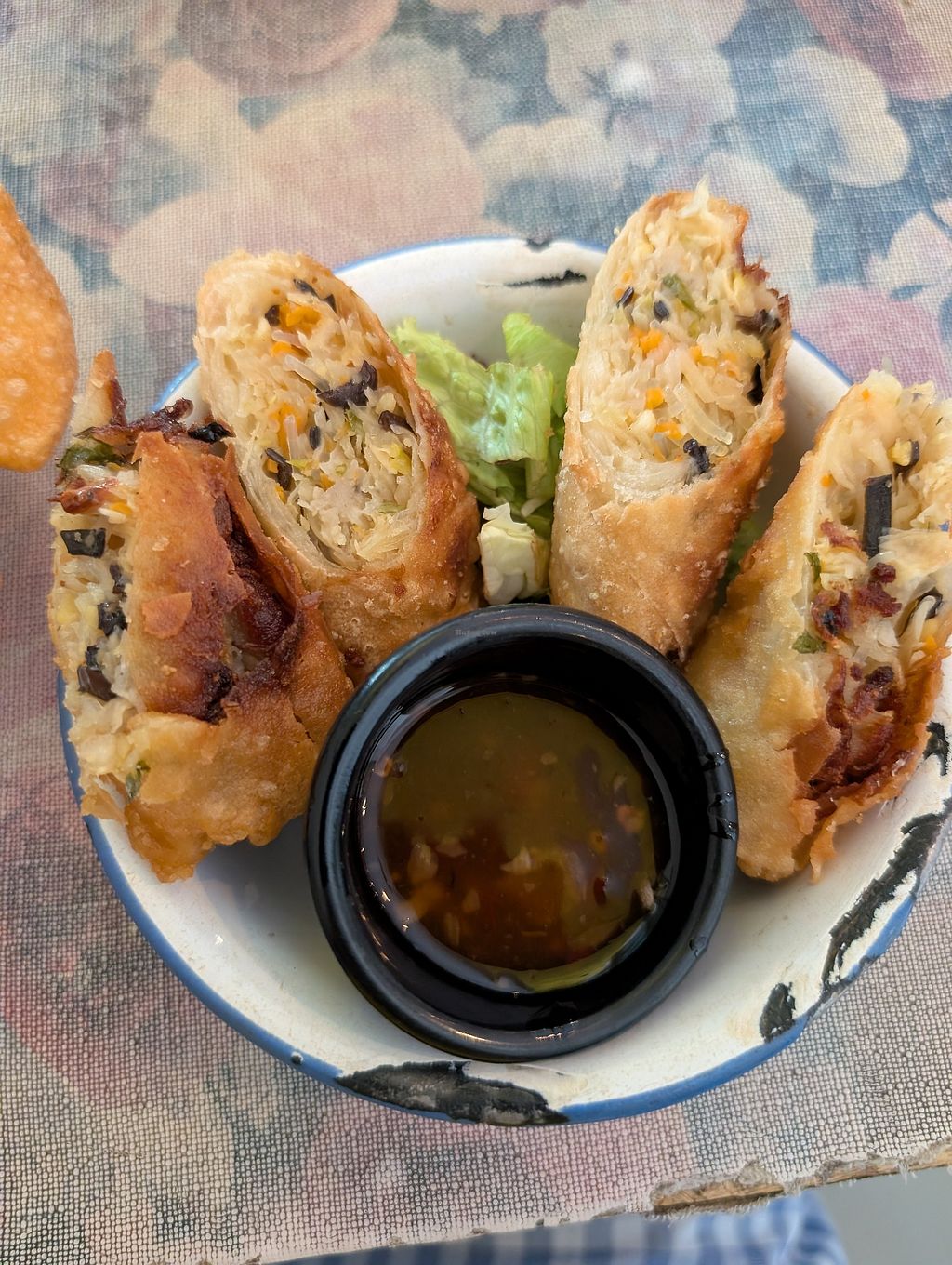 Pho Pia (21) - Gold baked spring rolls with tofu, morels, taro, glass noodles and vegetables, served with plum chili dip.