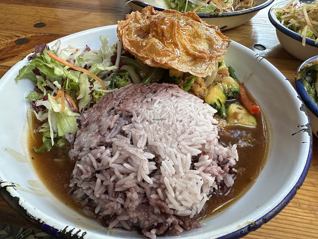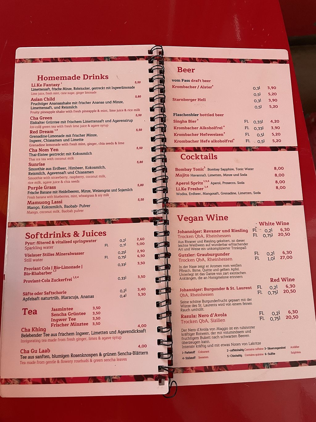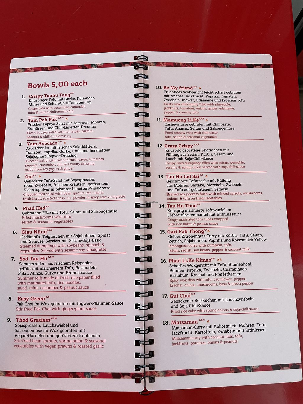 Hier gibt's viele verschiedene Bowls, zum Sattwerden muss man 3 Stück bestellen. Super zum Teilen! Es gibt aber auch Hauptgerichte. Das Prinzip ist also sehr ähnlich zu '1990 Vegan Living' um die Ecke. Ich bin hier aber lieber als bei 1990, weil der Andrang nicht so groß ist, es geräumiger ist, und man trotzdem sehr leckeres Essen bekommt. Die thailändische Einrichtung ist auch sehr schön.