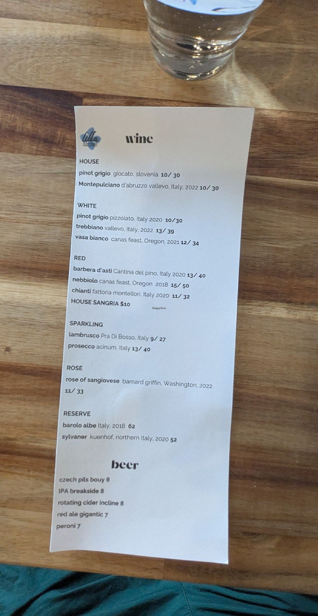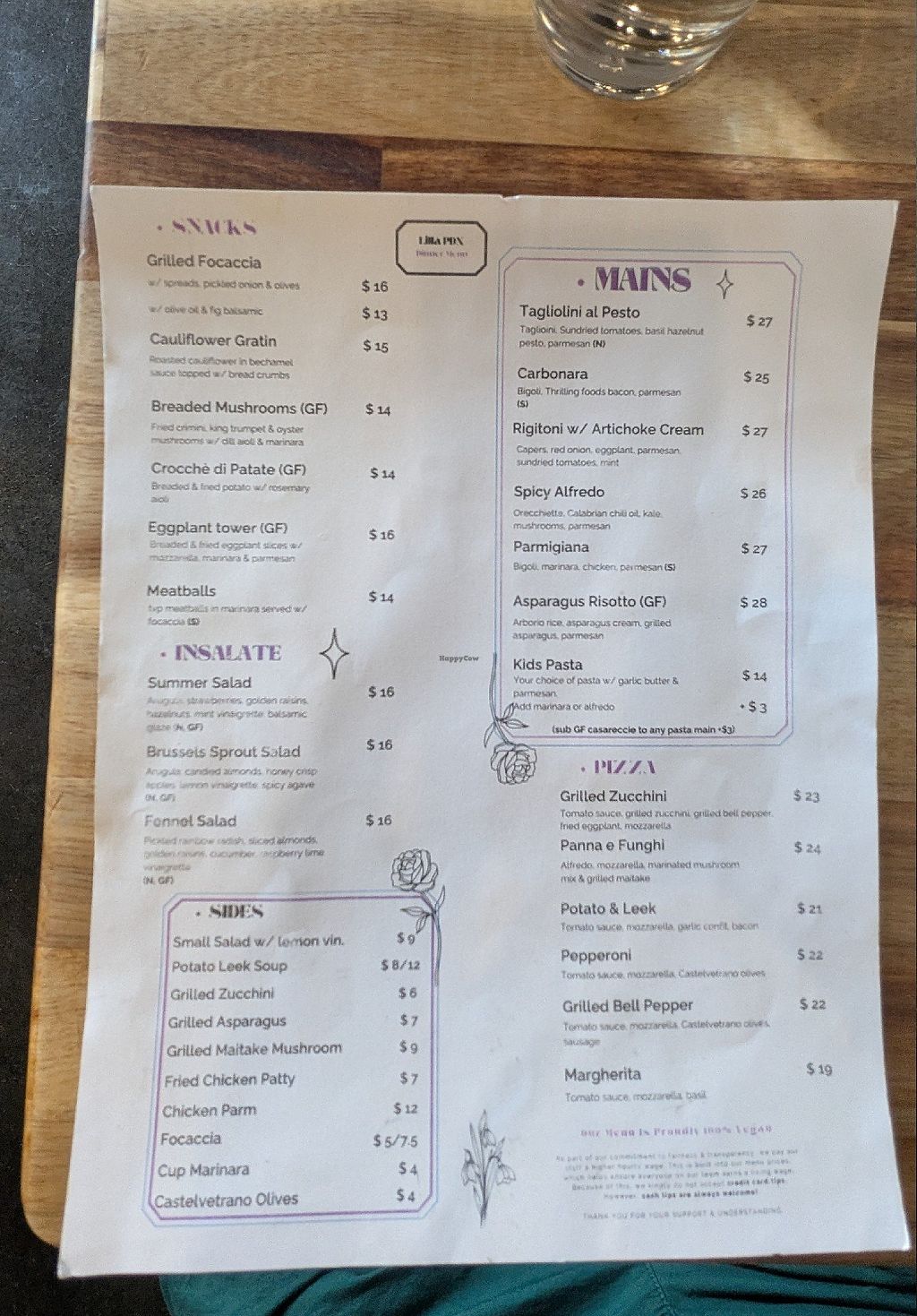 Just finished a wonderful dinner at Lilla. Abby the hostess/waitress/bartender was amazing and the food was delicious: eggplant tower, rigitoni with artichoke cream, grilled zucchini pizza and sweeter innocence mocktail were all fantastic. Highly recommend!