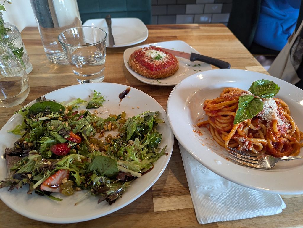 Food was delicious, I recommend the rigatoni with artichokes and sundried tomatoes, the eggplant tower, and the breaded mushrooms. The Carbonara was decent, as was the focaccia.