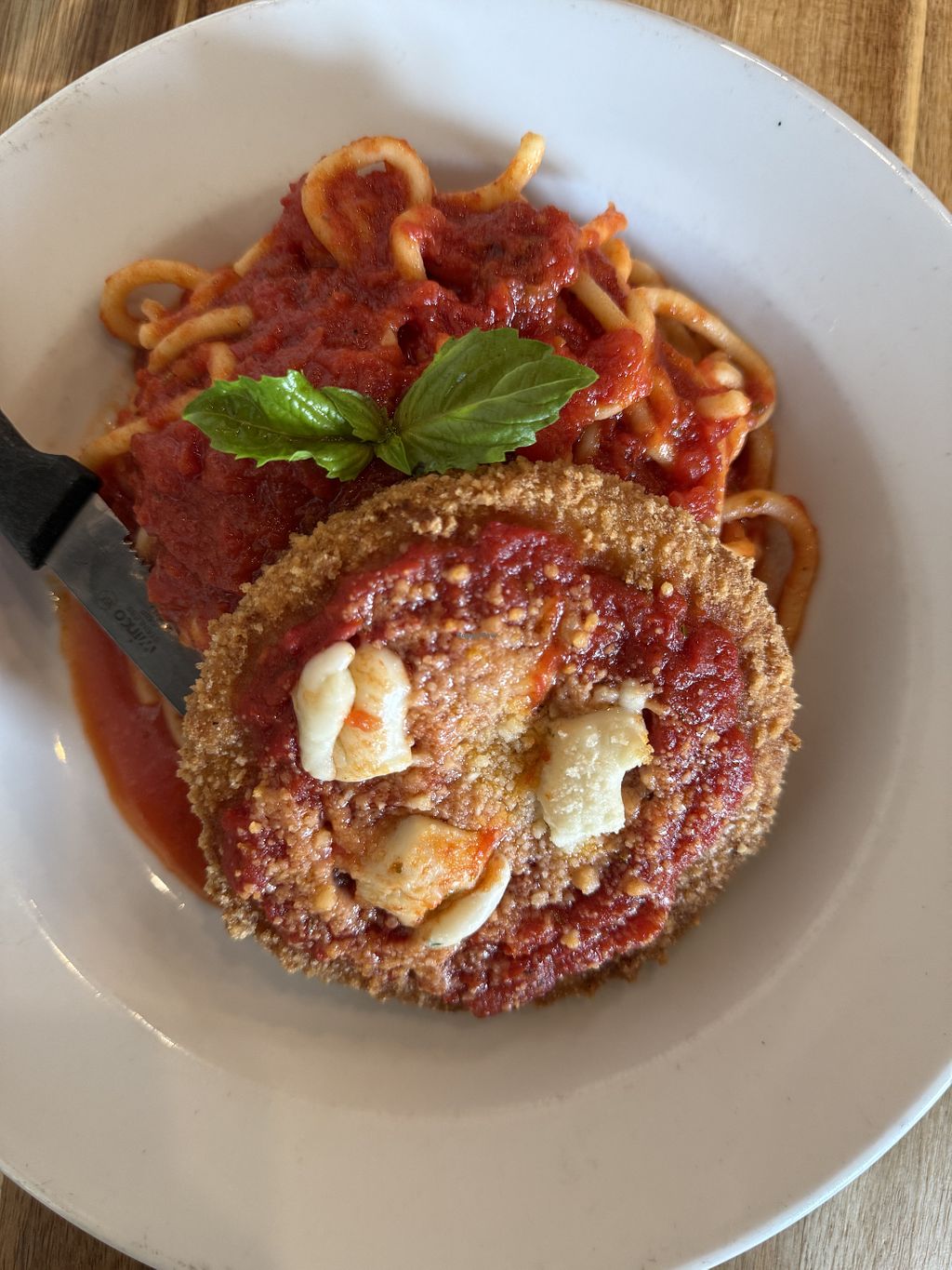 Cozy atmosphere, good food and drinks. I got a mocktail and the chicken parm.