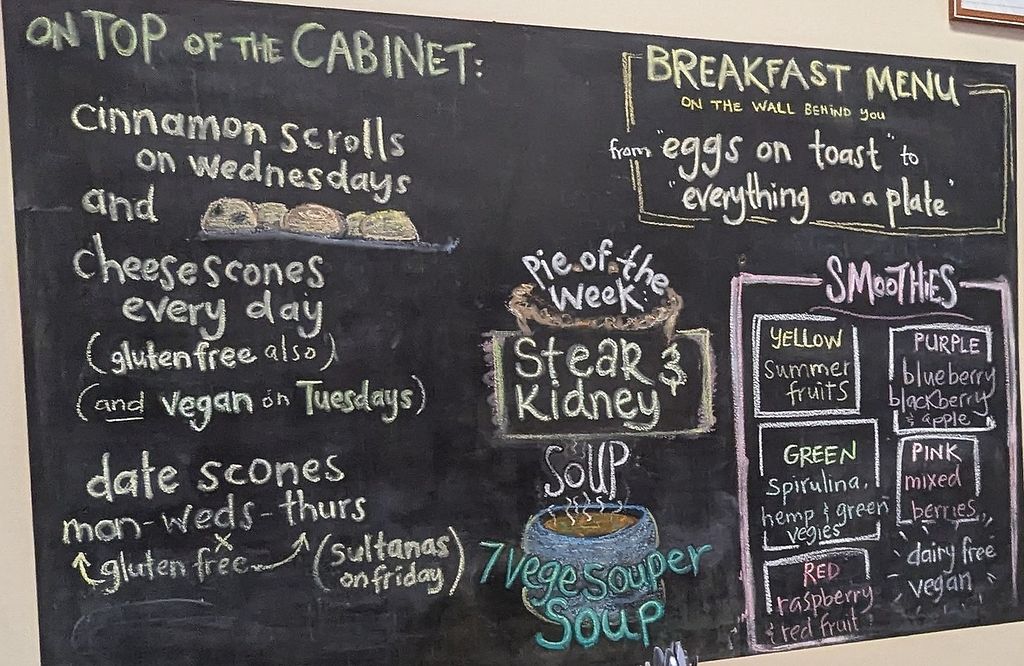 Lots of vegan options including a sausage roll, cakes, salads, smoothies, vegan cheese… great coffee..