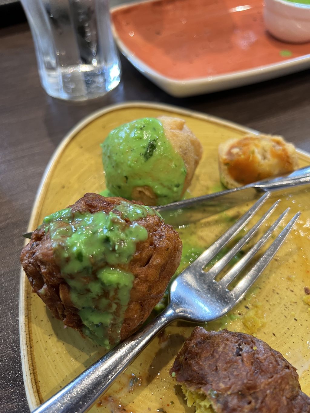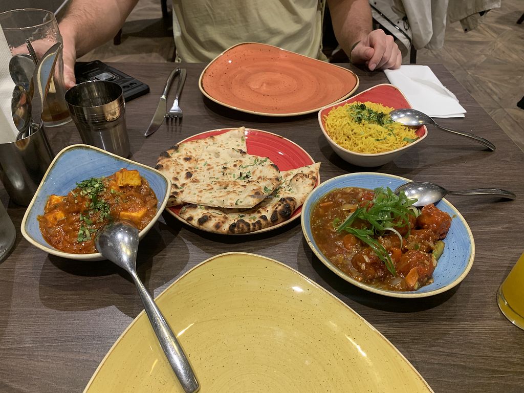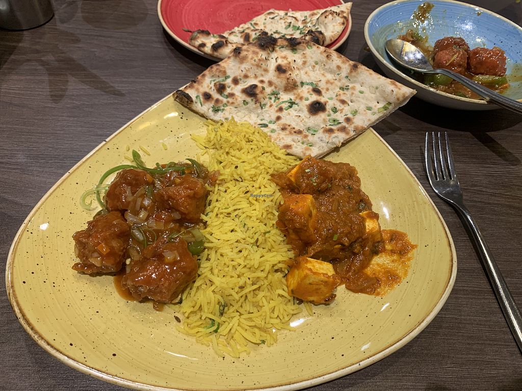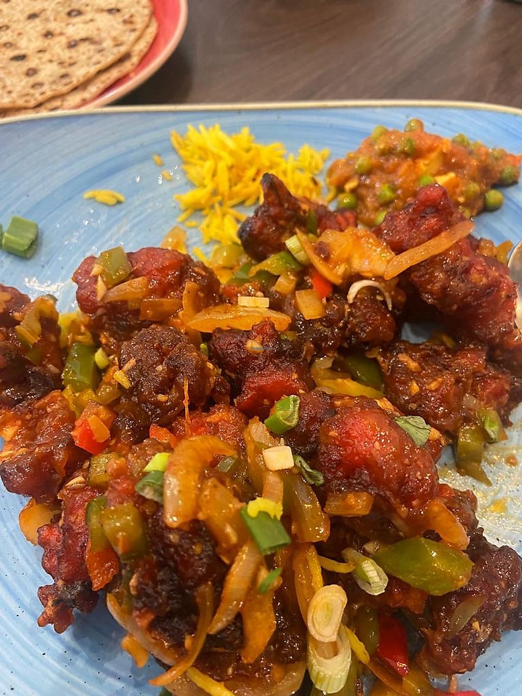 We ordered crispy bhajiya for starters. Huge portion - one enough between two (but we ate a portion each!) then Manchurian cauliflower and vegan mutter paneer (tasted and textured like real paneer) the pilau rice was light and fluffy. The meal was delicious. Not at all greasy. Flavoursome and despite feeling full it was the type of food where you can’t bear to leave any because it’s so good.