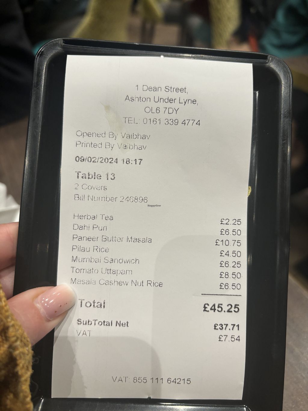 Read moreWe had Uttapam which was really really good, the Mumbai sanwich which was tasty but could do with more chutney so maybe ask for more on the side, dai puri which was tasty and big portion. The paneer butter masala was disappointing, paneer was good but the curry was not for me, was not buttery at all was more tomato based and lacked flavour.