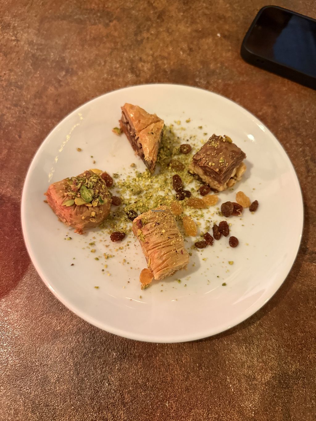 My friend and I ordered a mix of small dishes. It was really tasty, especially the falafel! The baklava as desert was really good, it was a variety of different types. Although it was expensive. As a main dish there’s only 1 vegan option. There’s lots of vegan small dishes which you can order separately