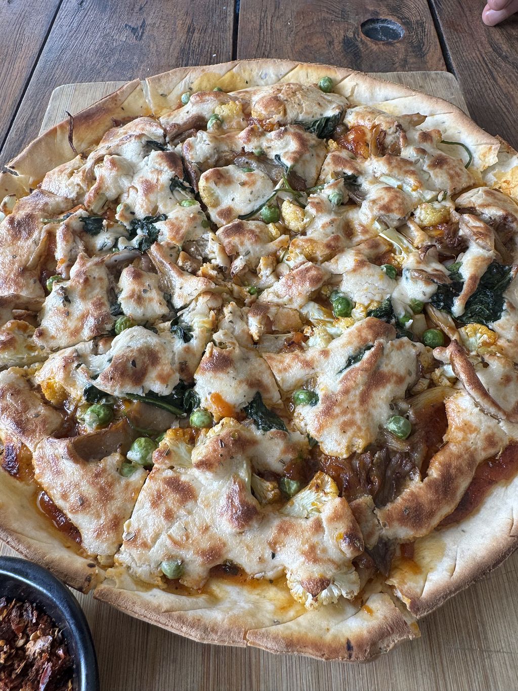 Nutritious, colourful, large portion sizes. Excellent eggplant falafel buddha bowl (nb eggplant/aubergine is fried in batter). Pizzas are pan style. Service was on the slow side.