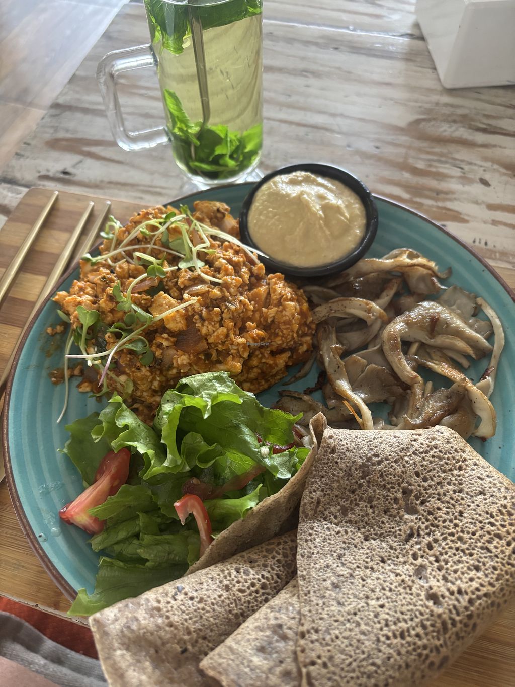 We came back three days in a row because I couldn’t get enough of the protein salad. We also tried the vegan breakfast with tofu scramble and mushrooms, which was amazing.