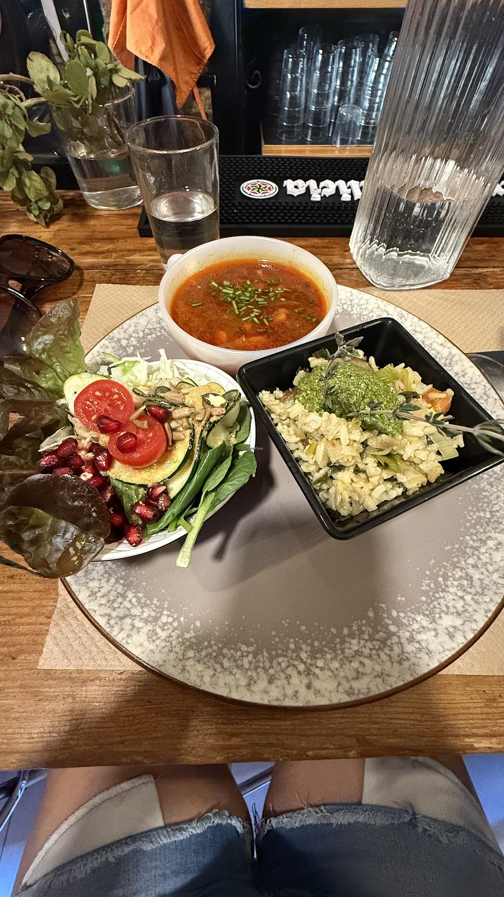 I loved almost everything about this place! The menu changes daily I believe. When I went I had a flavourful cold soup, a salad with hummus-type dip and rice roll thing, and a fig custard dessert. Everything is beautifully presented and made with care, I felt full at the end but not heavy. Great value for the quality of the food you get.