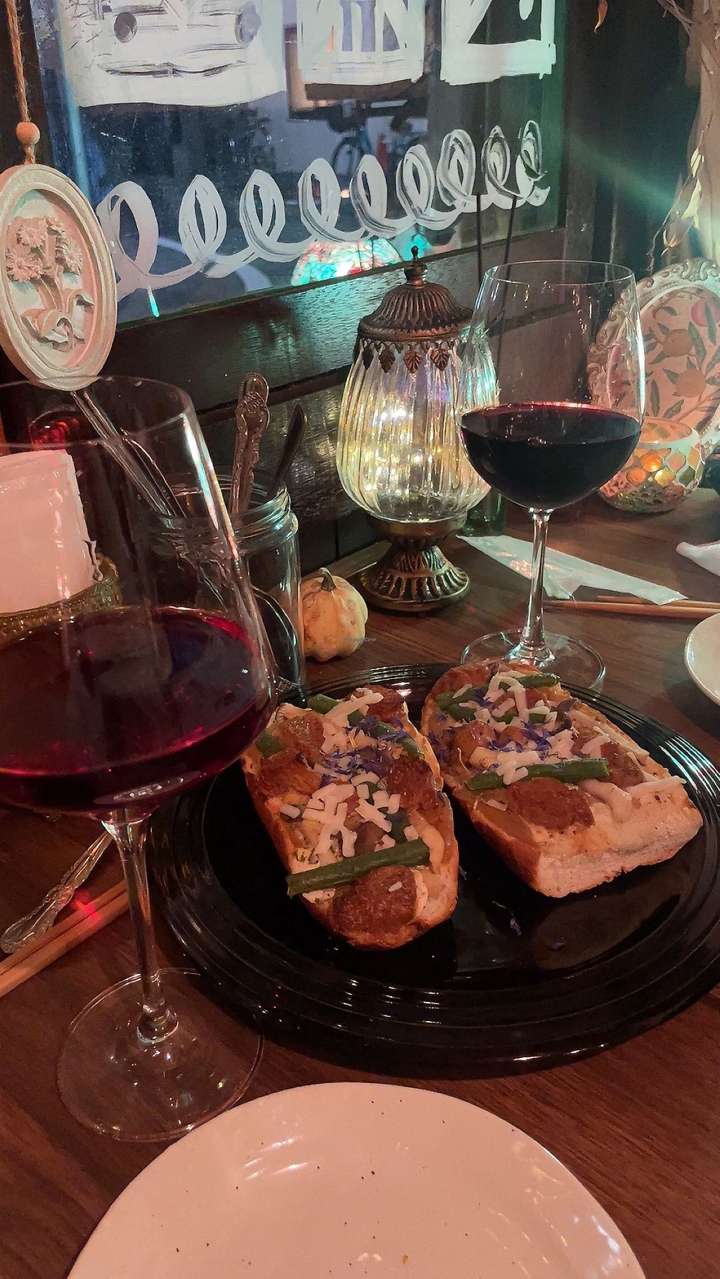 We got the vegan cheese plate, berry mojitos, spring rolls (OMG), teriyaki pizza, Margherita pizza, soy steak, and falafel sandwich, and a local micro brew beer. Everything was amazing, the spring rolls were definitely my favorite. The vibe was cool, there was only one woman hosting, serving, and cooking but it was empty except for us, so we had great service.