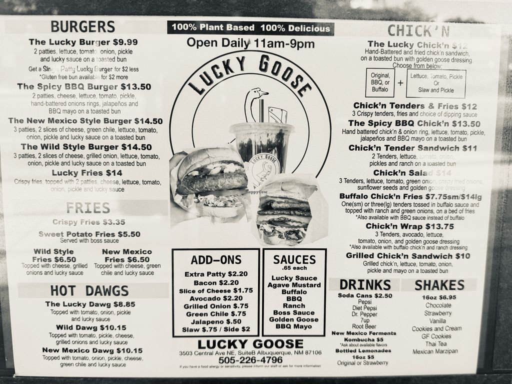 This is my first time in Albuquerque and first time here! I got the lucky chick’n sandwich buffalo, my partner got the spicy bbq burger and we split the New Mexico fries 10/10.