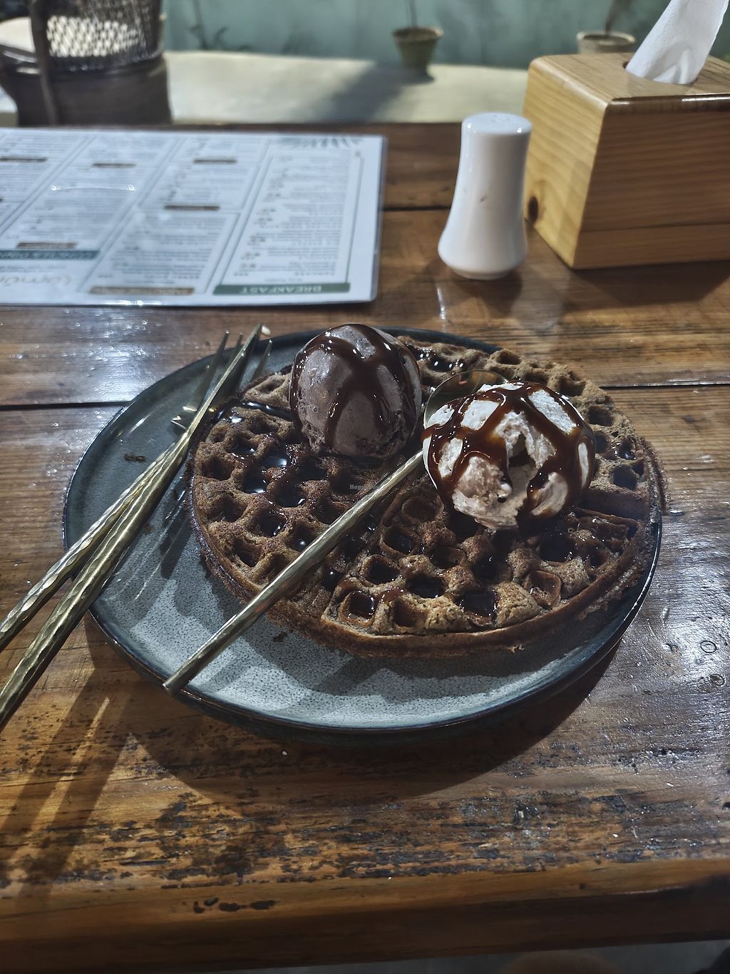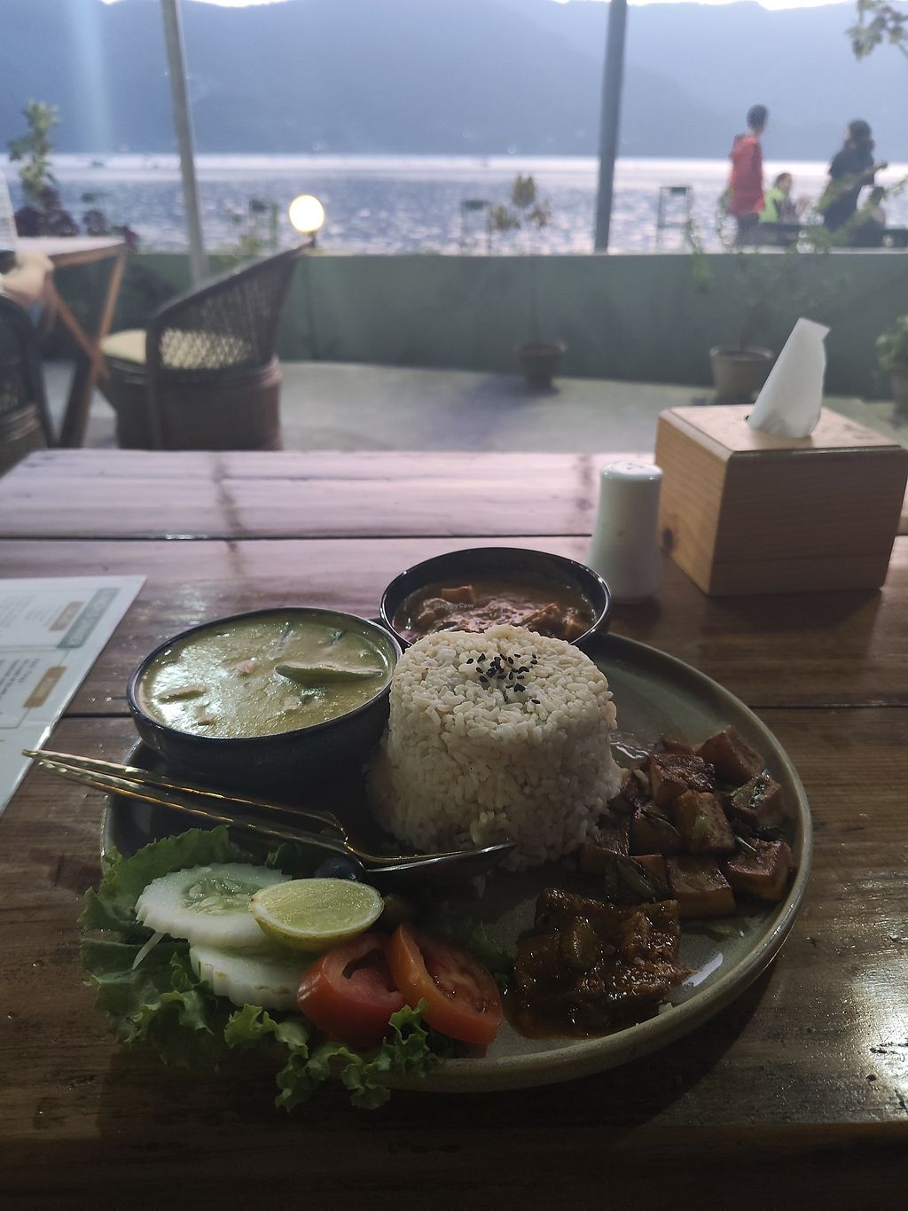 The food was just unimaginably great, my tofu curry's were rich in flavour and the portion was the right size aswell. The soy burger was described by my friend as 'probably the tastiest burger I've ever had' and my waffle dessert with ice cream was just fabulous. The view from the restaurant on the lake was beautiful and there was a great atmosphere and ambience