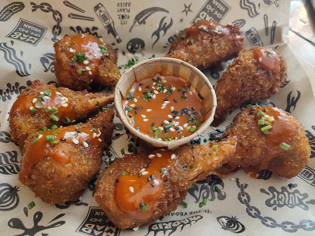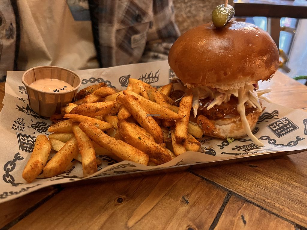 Vegan fast food restaurant specializing in burgers. Also serving tacos, fries, currywurst, onion rings, nachos, and nuggets. Has cakes, brownie, and self-produced craft beer. Est. 2019 previously at Mercado de San Ildefonso. Order for delivery via website. Open Mon-Sun 13:00-00:00. Kitchen closes half hour before restaurant.