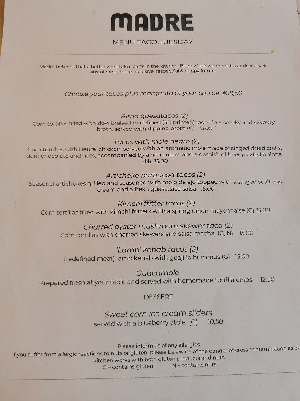 My wife and I have been vegan for 10 years and this was by far the best Mexican food we have ever eaten. Madre is warm and welcoming and offers a fine dinning experience with normal size portions.