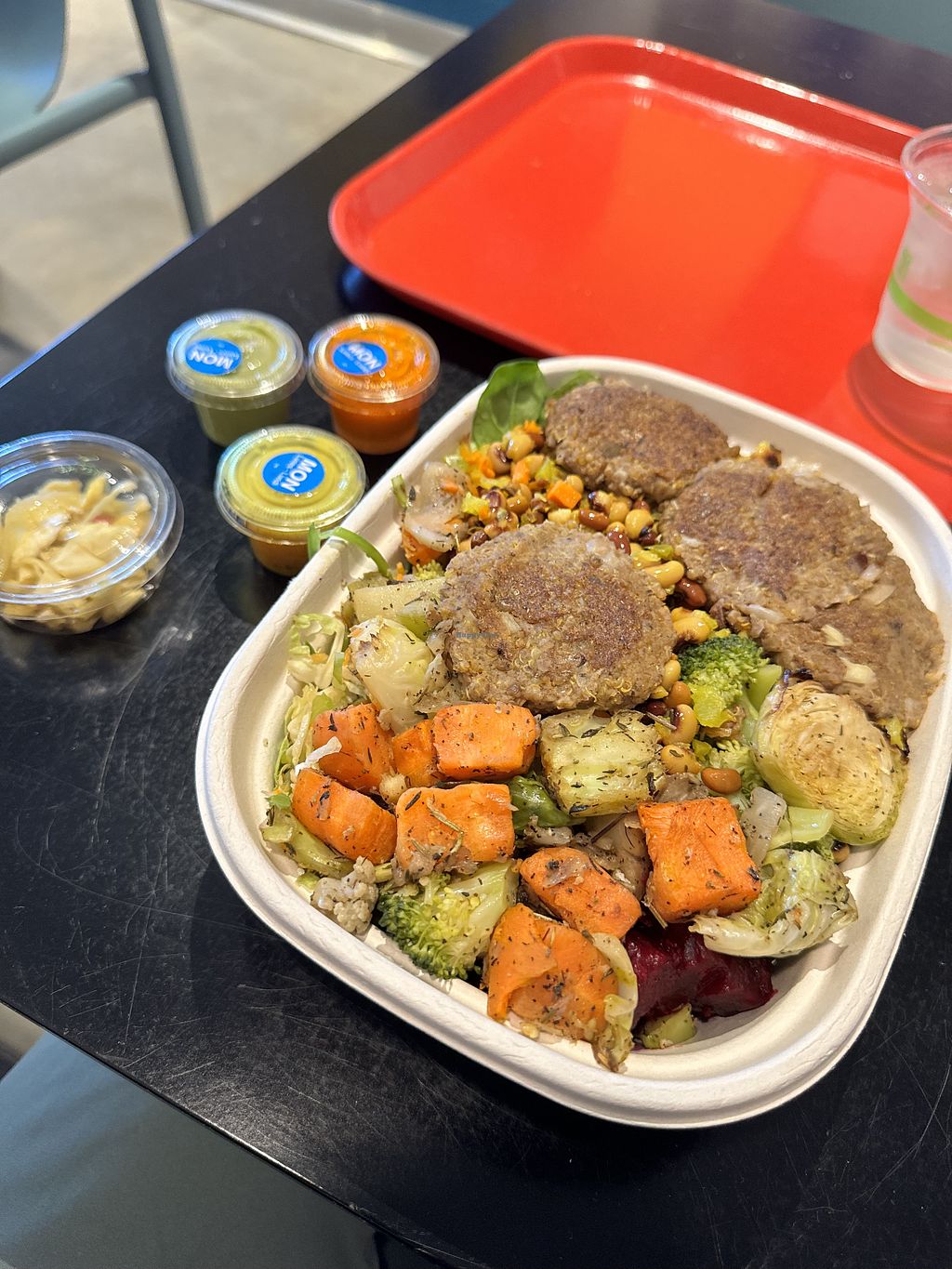 I got a bowl with sweet potato as my base, cucumber salad and bean salad as my sides, tofu as my protein, and spicy avocado as my dressing. It was delicious. The tofu was a bit salty for my taste, but I liked the seasoning. I want to try the fritters next time. All of their packaging and utensils are comparable. They need to open more of these around the city.