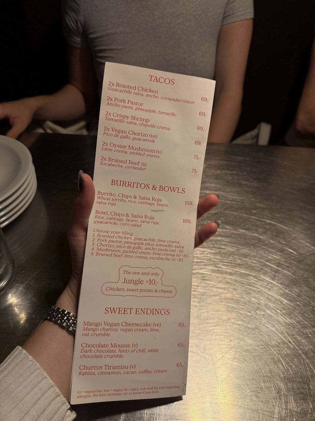 I had the vegan tacos with vegan chorizo. It tasted really good and was surprisingly spicy! The nachos with guacamole was also good. We tried the non alcoholic lemonade with mint, lime and cane sugar - it was very good!