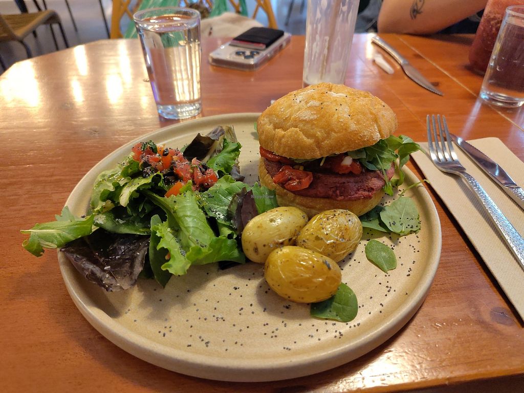 Serves meat, vegan options available. Health conscious restaurant serving brunch. Offers vegan choices such as burgers, hummus, guacamole, avocado toast, chia pudding, custom plates with choice of toppings, smoothies and oat milk with coffee. Open Mon-Thu 10:00-17:00, Fri-Sat 10:00-20:00, Sun 09:30-20:00.