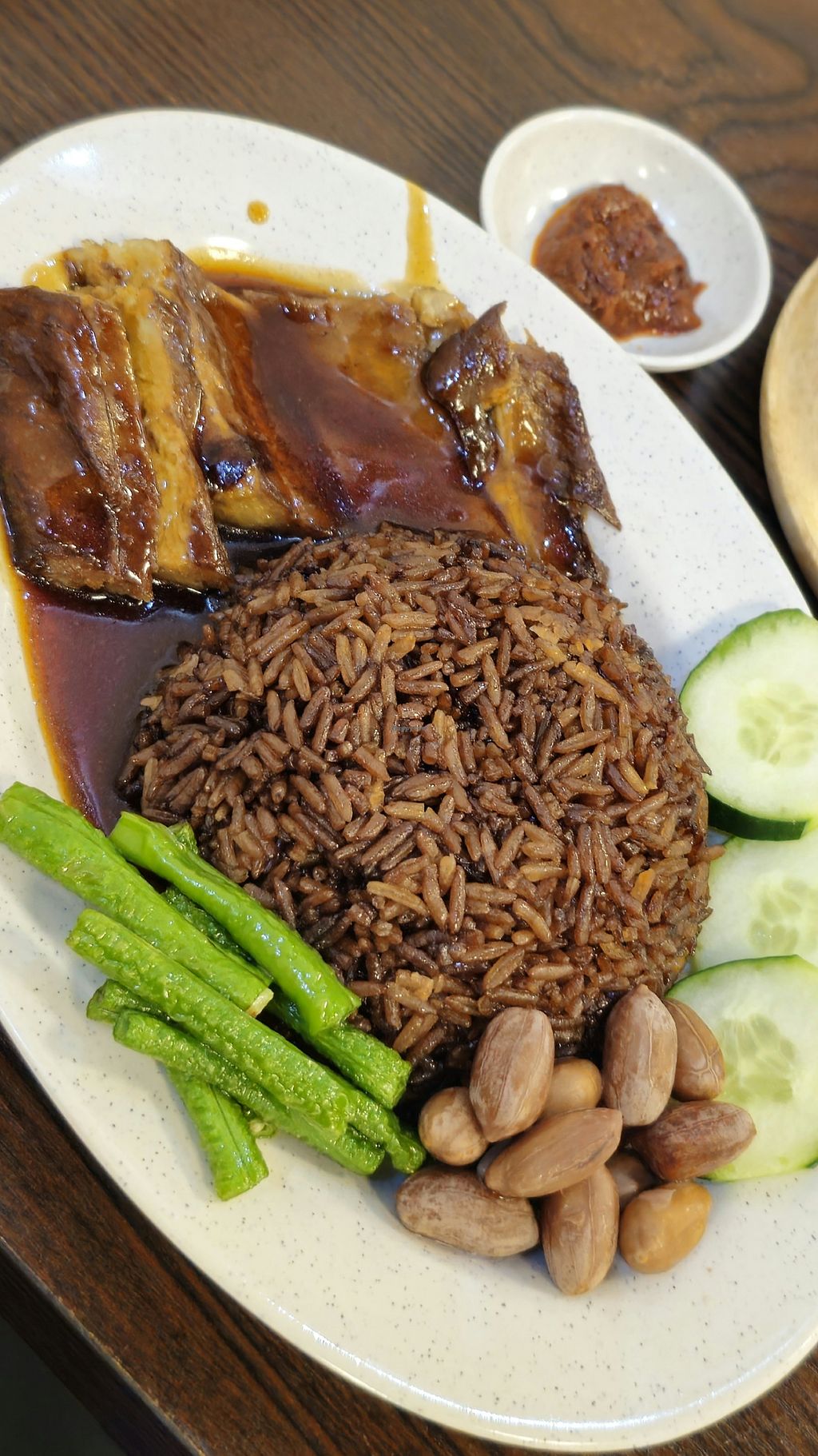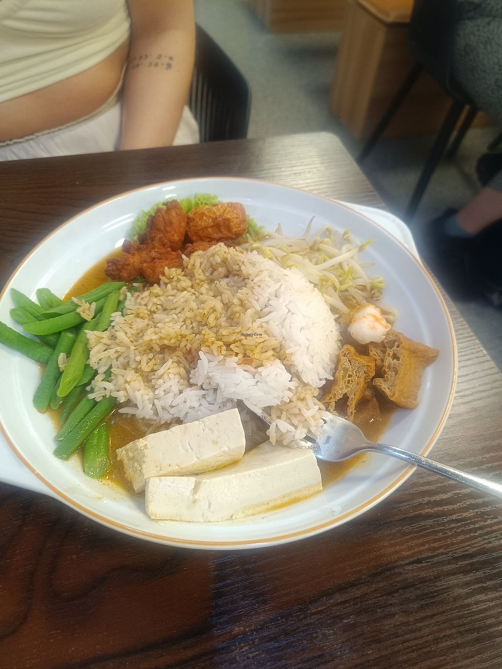 Vegan Fried Chicken Nasi Lemak - Rich Coconut Rice, the pandan flavour a lot milder and fried chicken was very good. Sambal not so spicy. No peanuts. Fried vegan pork bits very nice and beans perfect.