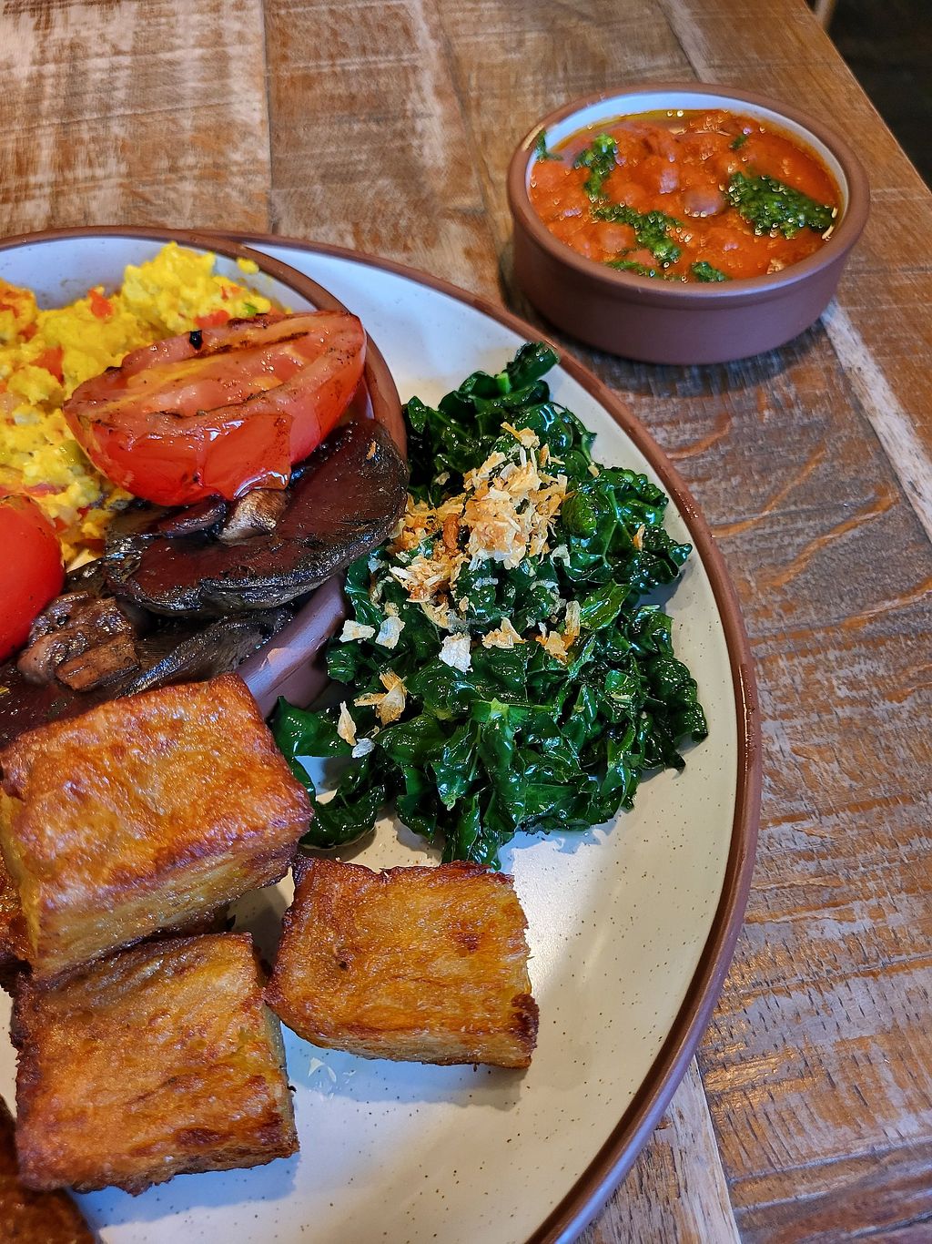 Great location next to the lively Borough Market, but inside it's an oasis of vegan deliciousness! We had a delicious brunch while enjoying the gorgeous interior. The portions are generous, and two savory and two sweet options will make anyone happy - we opted for the Mediterranean platter and the mango Ras Malai French toast and both were incredible!