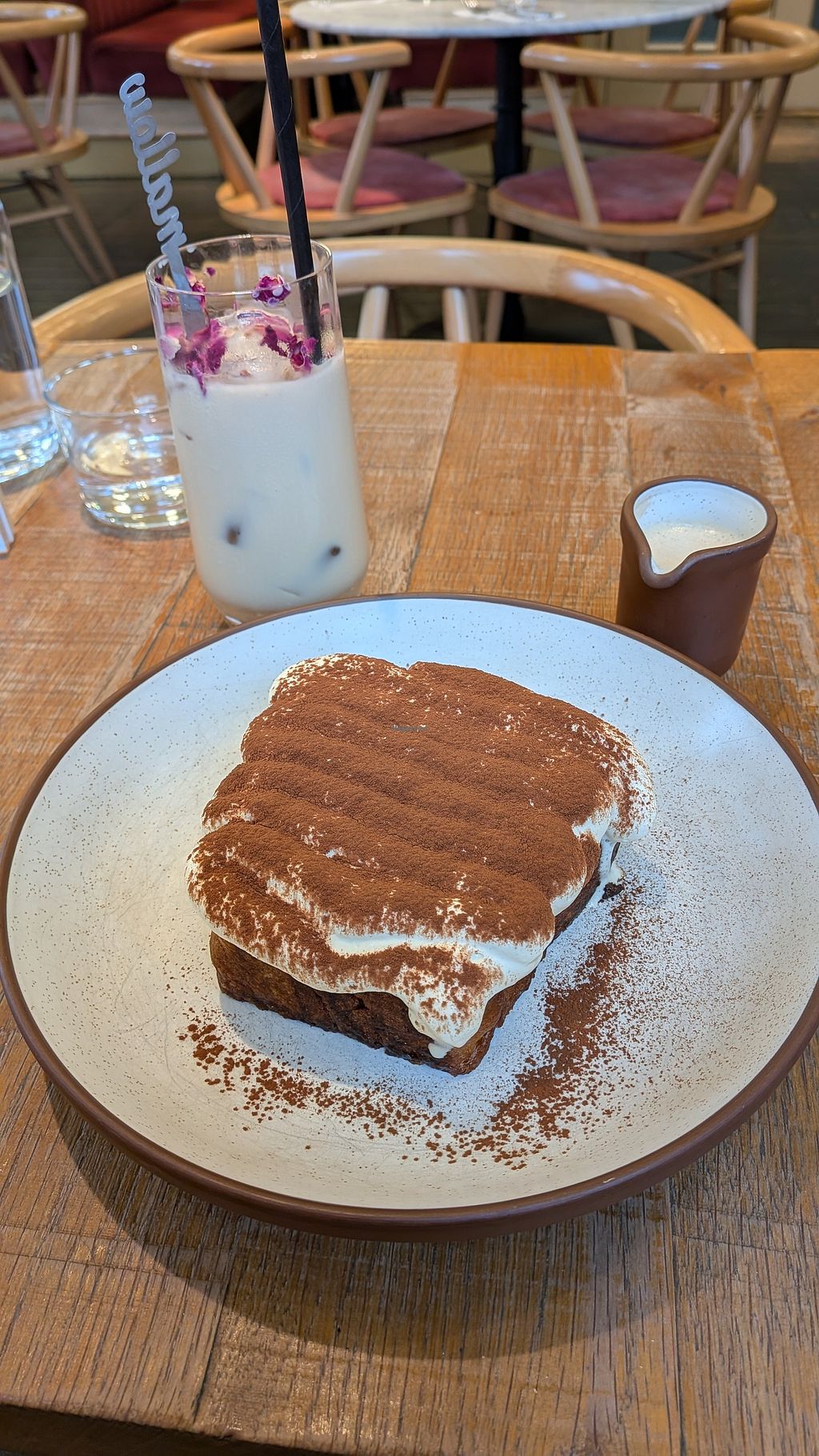 Got the tiramisu french toast and rose tea. Both incredible. Perfect location next to the markets and upstairs seating is really roomy