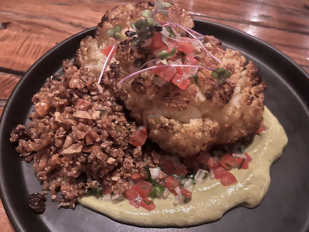 As for the main, cauliflower steak on avocado mousse with rice and beans. Satisfying and delicious.