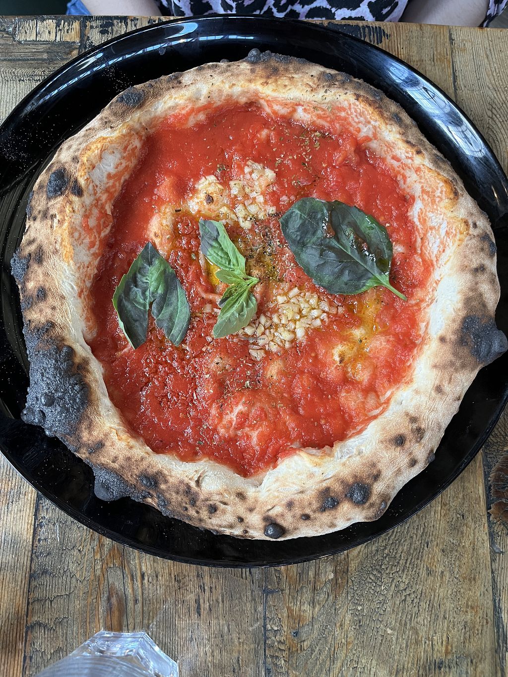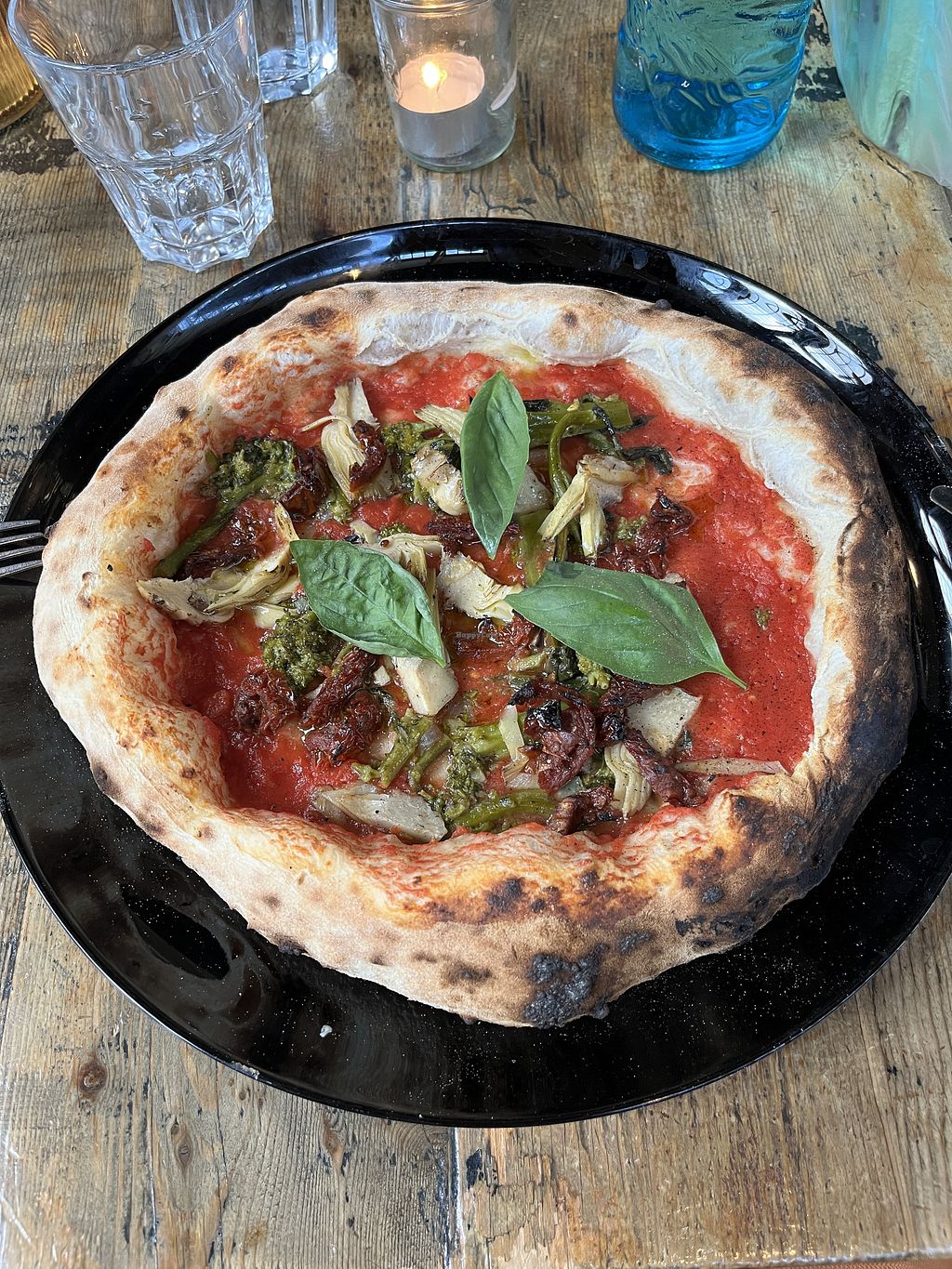 The pomodori pizza was great, and two other options were also available. Great dough and tasty veggies, with a drizzle of olive oil on top. The staff were also very nice, and the location inside a food market is also good.