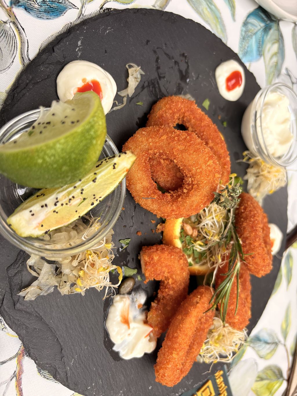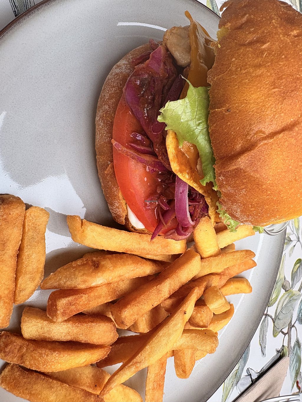 My dish was the pear risotto, and honestly the taste was a bit bland, the same with the filling of the mushroom croquettes. My friend had the pulled jackfruit burger, which looked very nice and the taste was fine. The home made of the day was delicious. The ‘tiramiblu’ a bit flat in taste. But nice environment and good service!