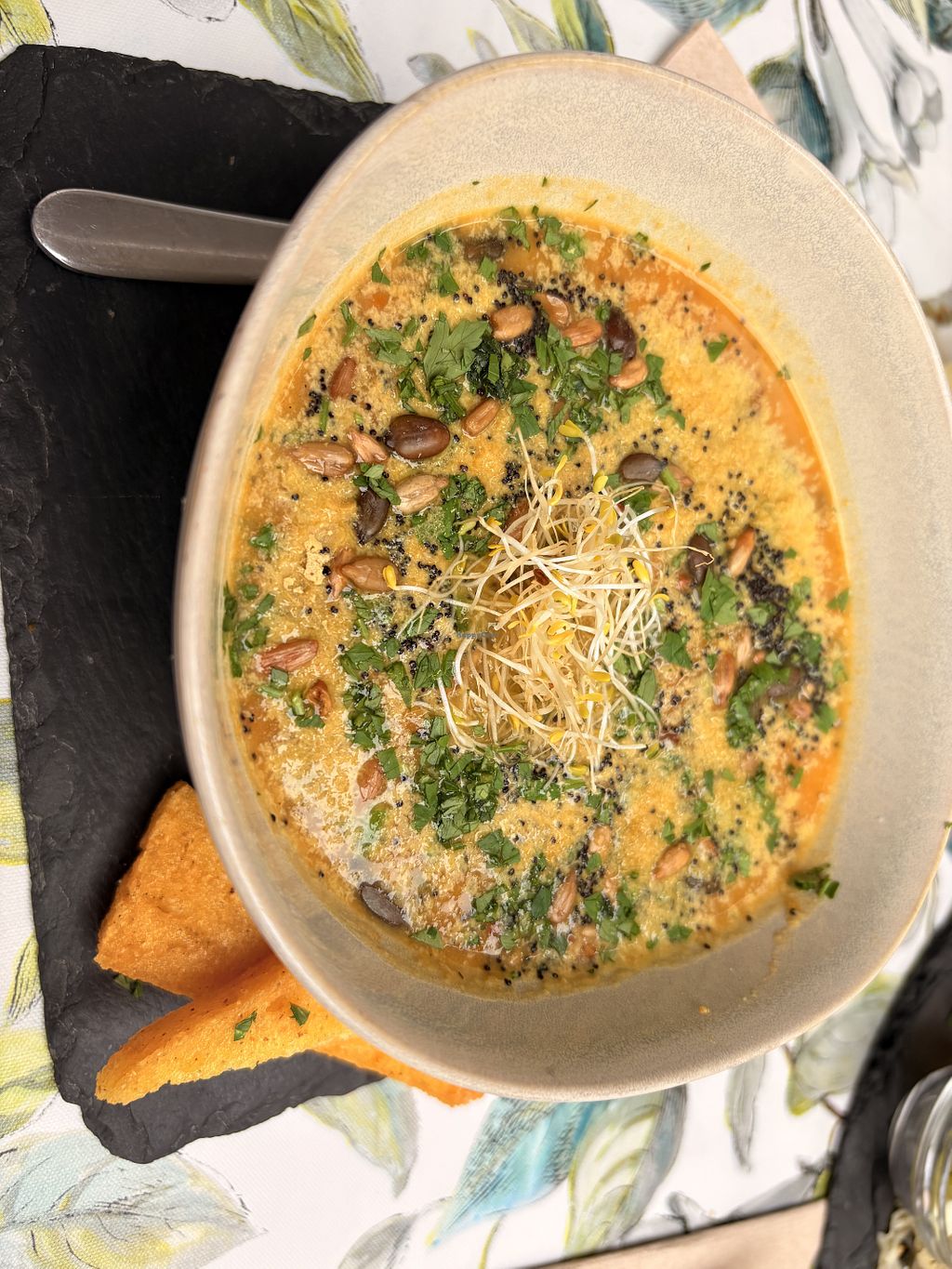 We ate pumpkin soup (seasonal soup) jackfruit burger, cheesecake. I will try something else tonight.