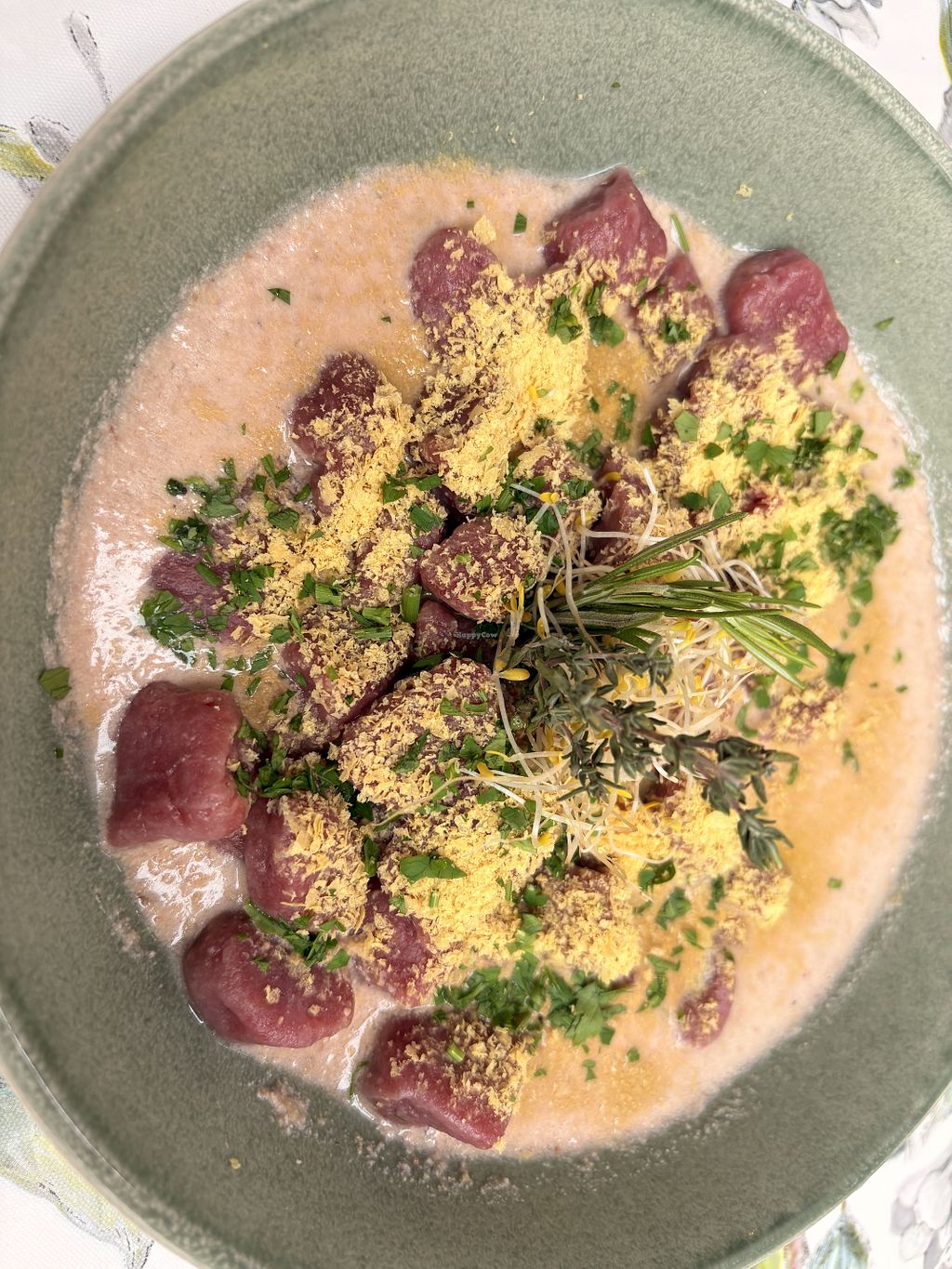 Read moreEdit 14-03: we went back by the end of the week because we liked the environment and the menu. The red gnocci was also a bit bland, the no chicken burger was very nice. The desserts were fine! (Choco mousse and cashew cake)