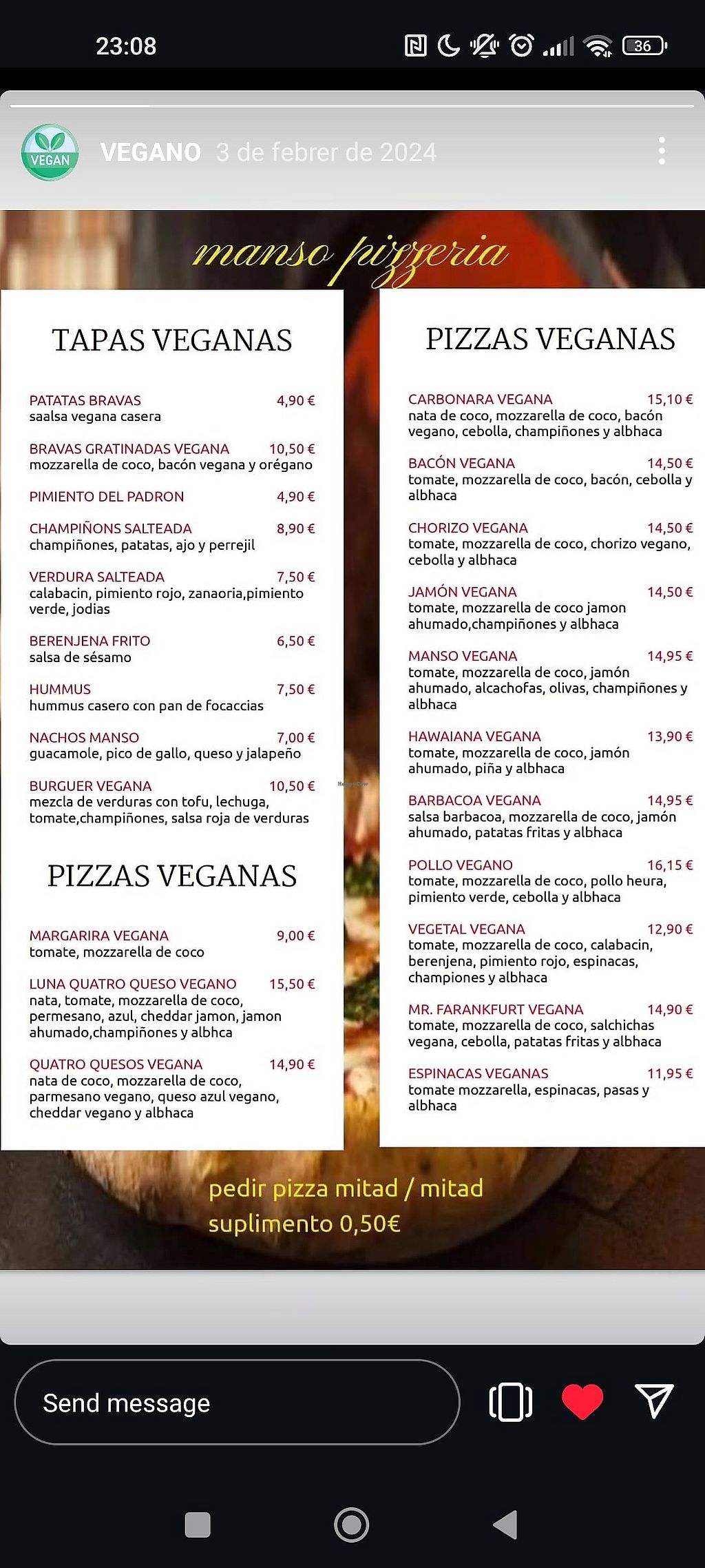 Came here very late in the evening and had a very friendly waiter plus a huge vegan menu (ask for it, they have a full vegan separate menu), crazy big amount of vegan pizza options plus many tapas. Really yummy pizza! 😍😛