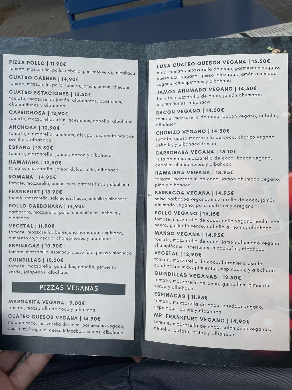 Carta súper variada de pizzas veganas, todas riquísimas