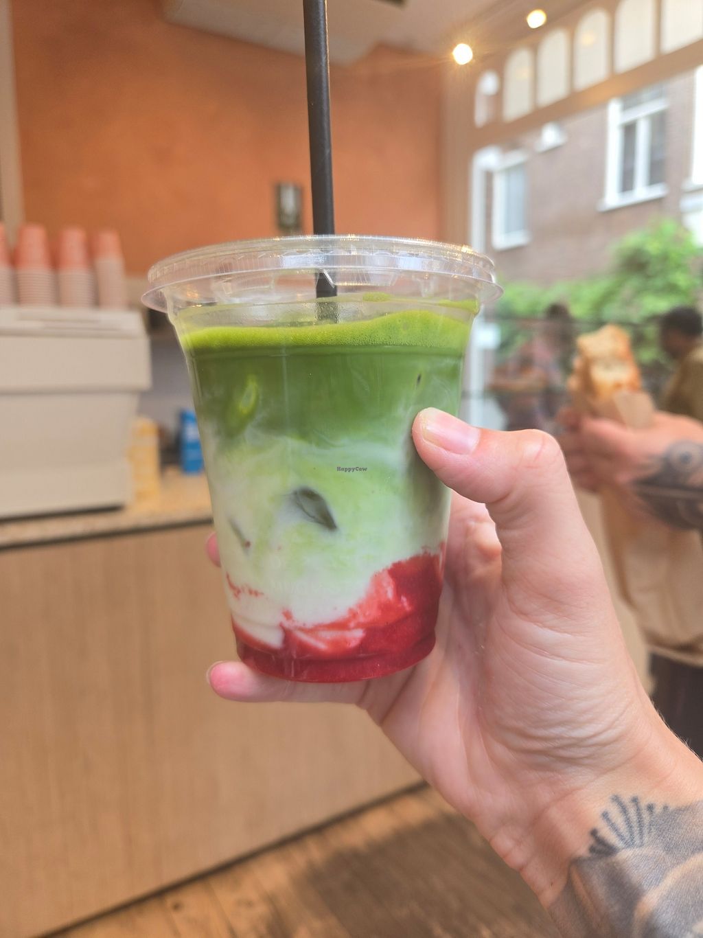 Amazing bakery - we had the Palestinian savory danish and the ham & cheese croissant and it was absolutely delicious. We will be dreaming of the croissant tonight - it tasted exactly how it looked: flaky but not crumbly, buttery, flavorful. The matcha was perfect too. Would be nice if there more possibilities to sit, as there are just a few benches inside and outside - but if kept in mind it is totally fine. We will be back soon! It’s a must try 💚