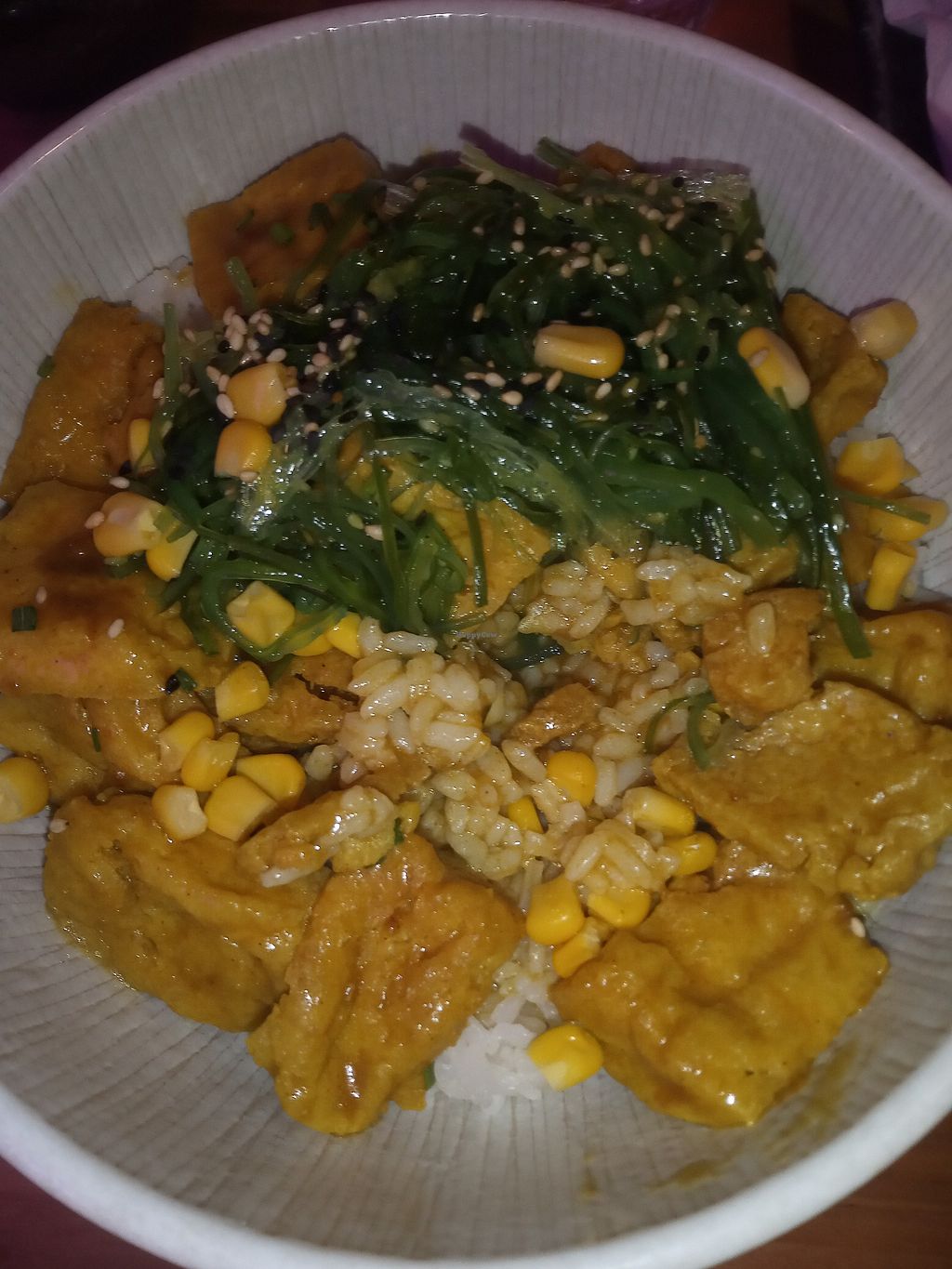 A few clearly marked vegetarian options. The dumplings were tasty, the tofu rice was adequate.