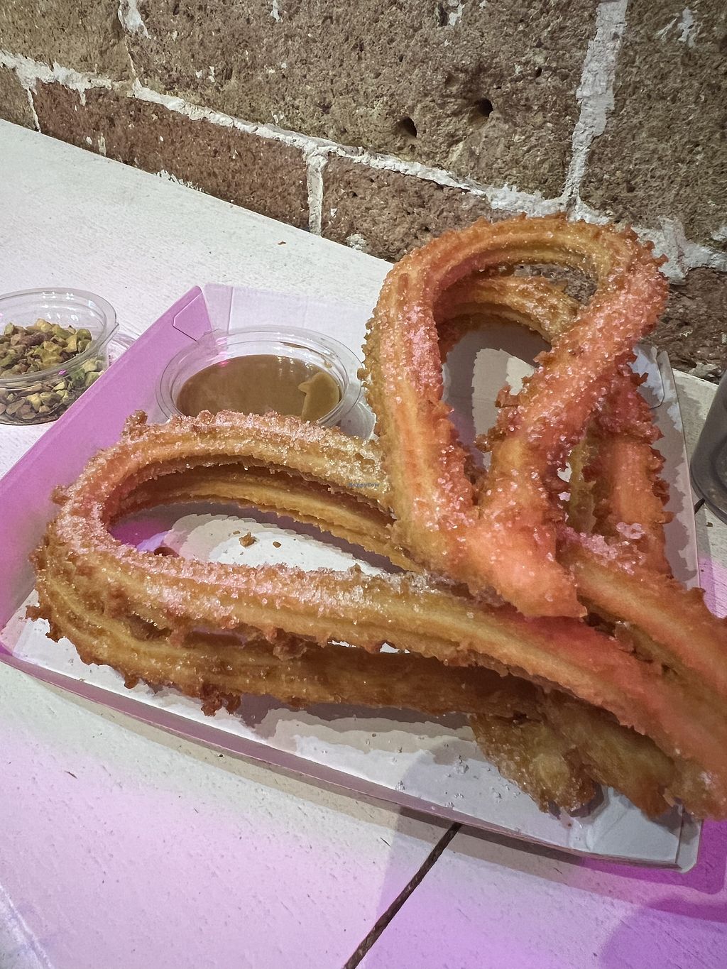 Churros are vegan, soft inside and crunchy outside. I've got 5 churros with biscoff cream and pistachio crumbs...and it was so delicious! Totally recommend!