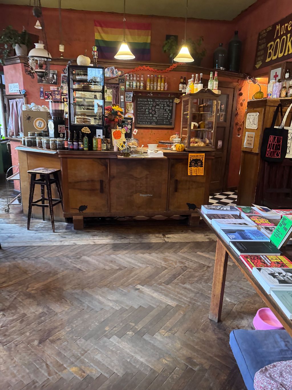 Pros: Lots of vegan options, Great coffee, Amazing book collection