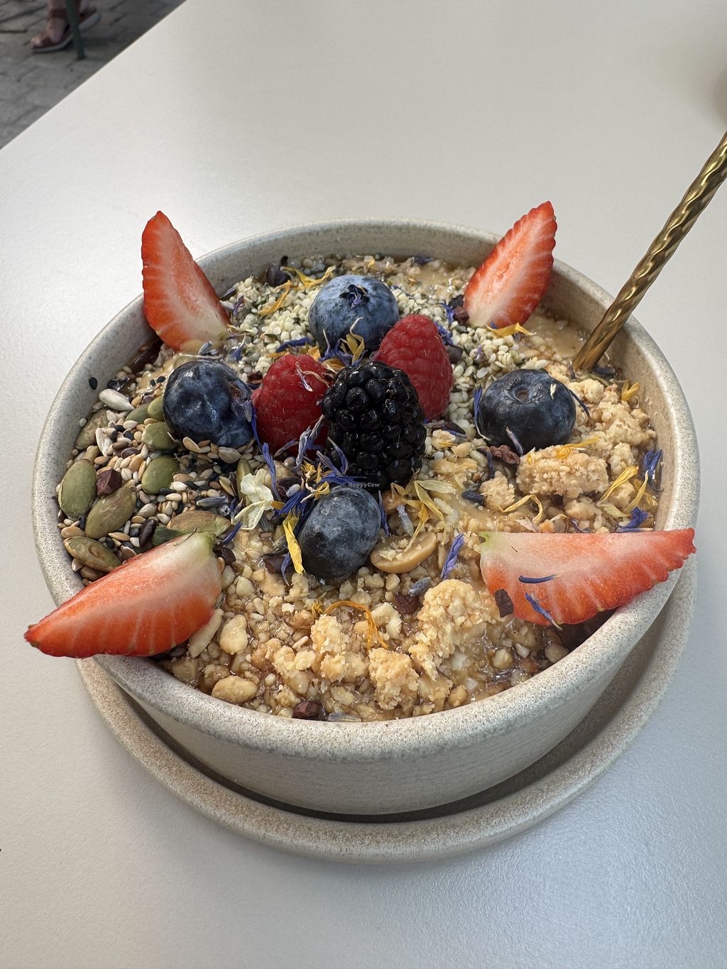 A new venue by Mama Carmen's is great news! As expected, the quality of the food, beverages and service is as excellent as at their other spots. They have a vitrine full of vegan pastries and some savoury snacks available for take away, as well as lots of cold bottled drinks. Additionally, you'll find pancakes, bowls and toasts on the menu, 80% of the dishes being plant based. Their list of beverages intrigues with a wide variety of specialty coffee and matcha, plus smoothies and cold pressed juices among others. My edamame hummus toast with avocado came loaded with fresh watercress, satisfying both the eyes and the palate. The organic homemade organic brioche was soft and the perfect base for this scrumptious dish. I couldn’t leave without trying their chocolate matcha. I had it with pea milk and really loved the blend of earthy aromas. As sweet treat I enjoyed a mini chocolate croissant and as per usual it was flaky and buttery with a perfect point of sweetness. The whole team spreads good vibes and is kind and fast. 100% recommended!