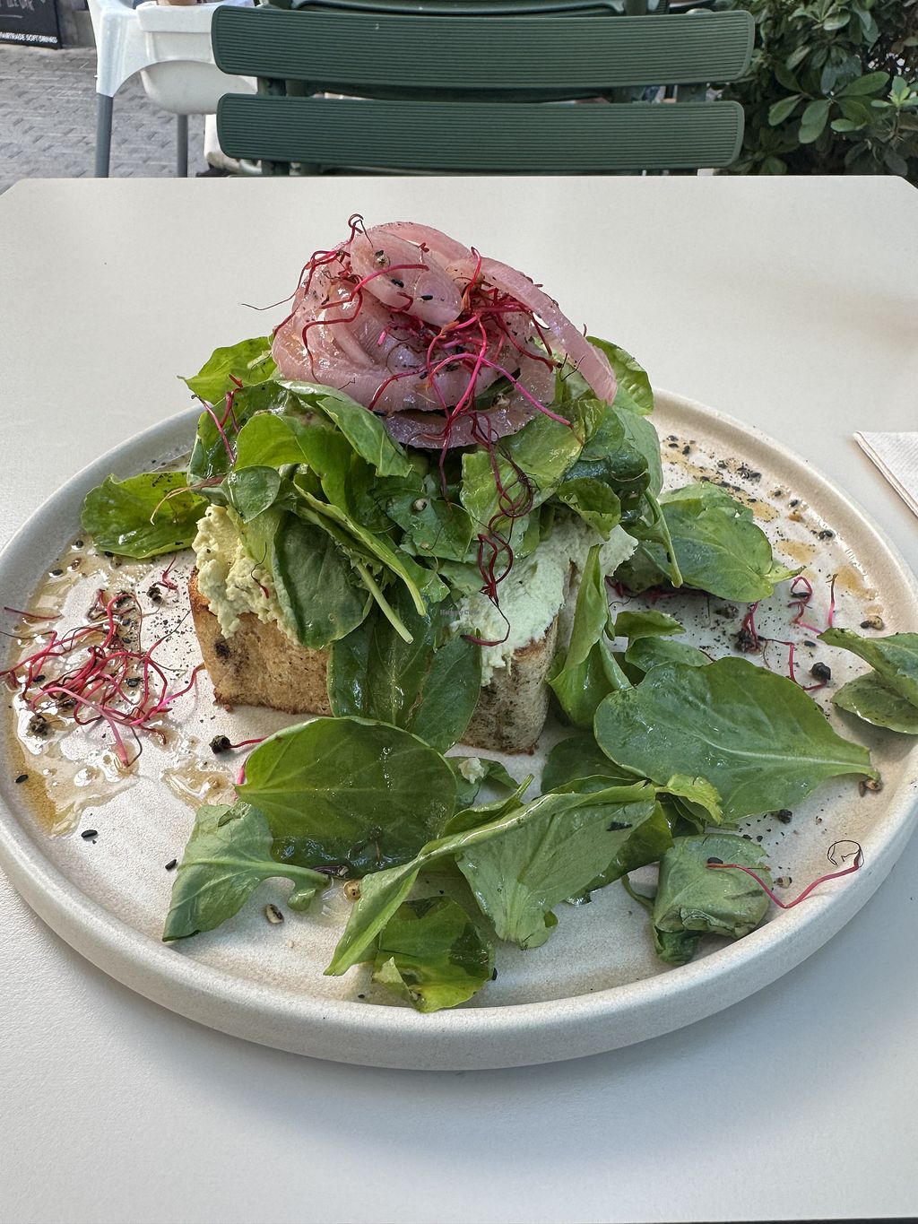 We had a Flat White with Oatly and a foccacia with dried tomato, Hummus and some sort of salami.