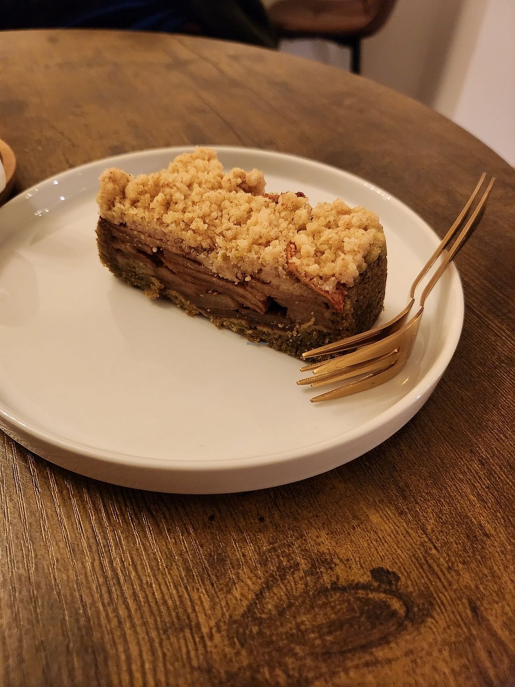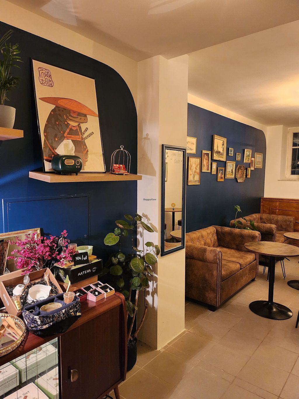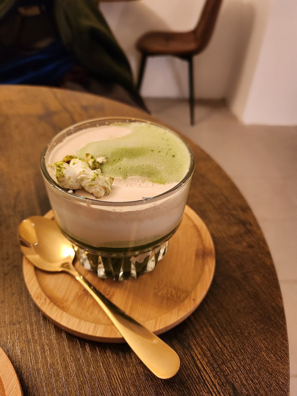 Cafe offering matcha drinks and vegan cakes. All matcha drinks can be made vegan with oat milk. Vegan options include matcha with vegan collagen, banana bread, and matcha mousse cake. Open Mon 11:30-18:00, Tue 12:00-06:00, Wed-Sat 12:00-18:00, Sun 11:30-18:00. Closed Mon.