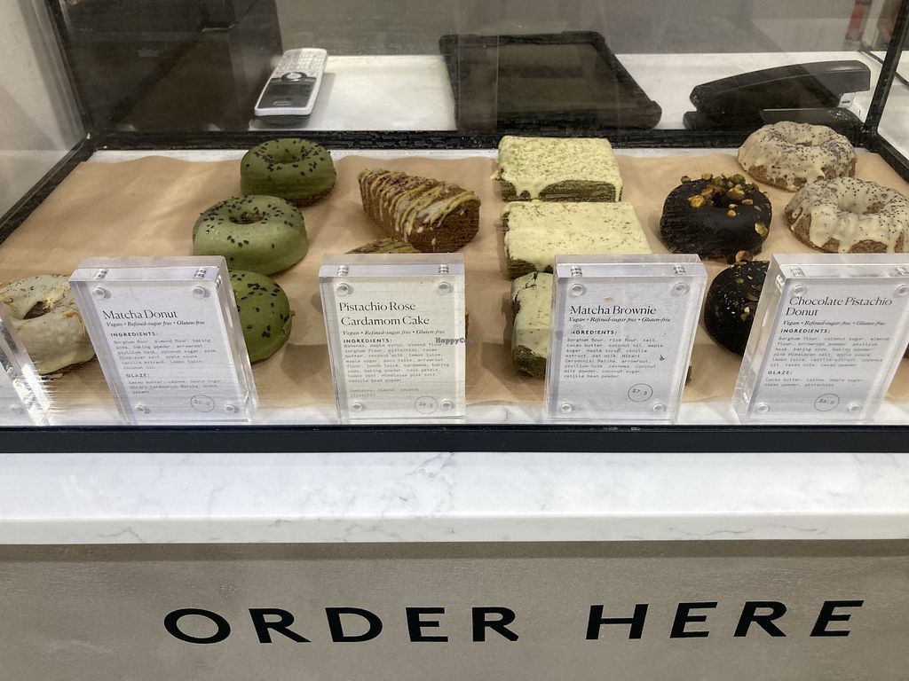 Has multiple locations. Offers matcha teas, smoothies, drinks, vegan pastries, snacks, and soft serve. All vegan except honey. Open Mon-Sat 8:00am-5:00pm, Sun 9:00am-5:00pm.