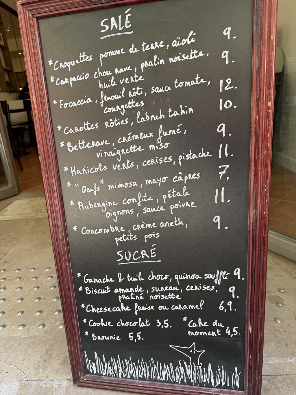 I had the carottes and also the aubergine (see attached menu for details). Both were excellent! For dessert I had the biscuit amande and it was absolutely amazing! And the café Viennese was great as well! (I would give it more than five stars if that was an option.)