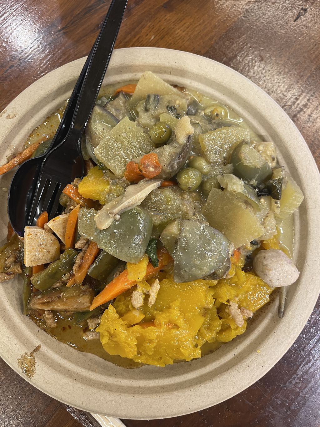 Fully vegan stall with a variety of vegan food. For only 60 baht you have a plate with rice and 3 dishes which you can choose yourself. They even heat it up in the microwave, bonus!