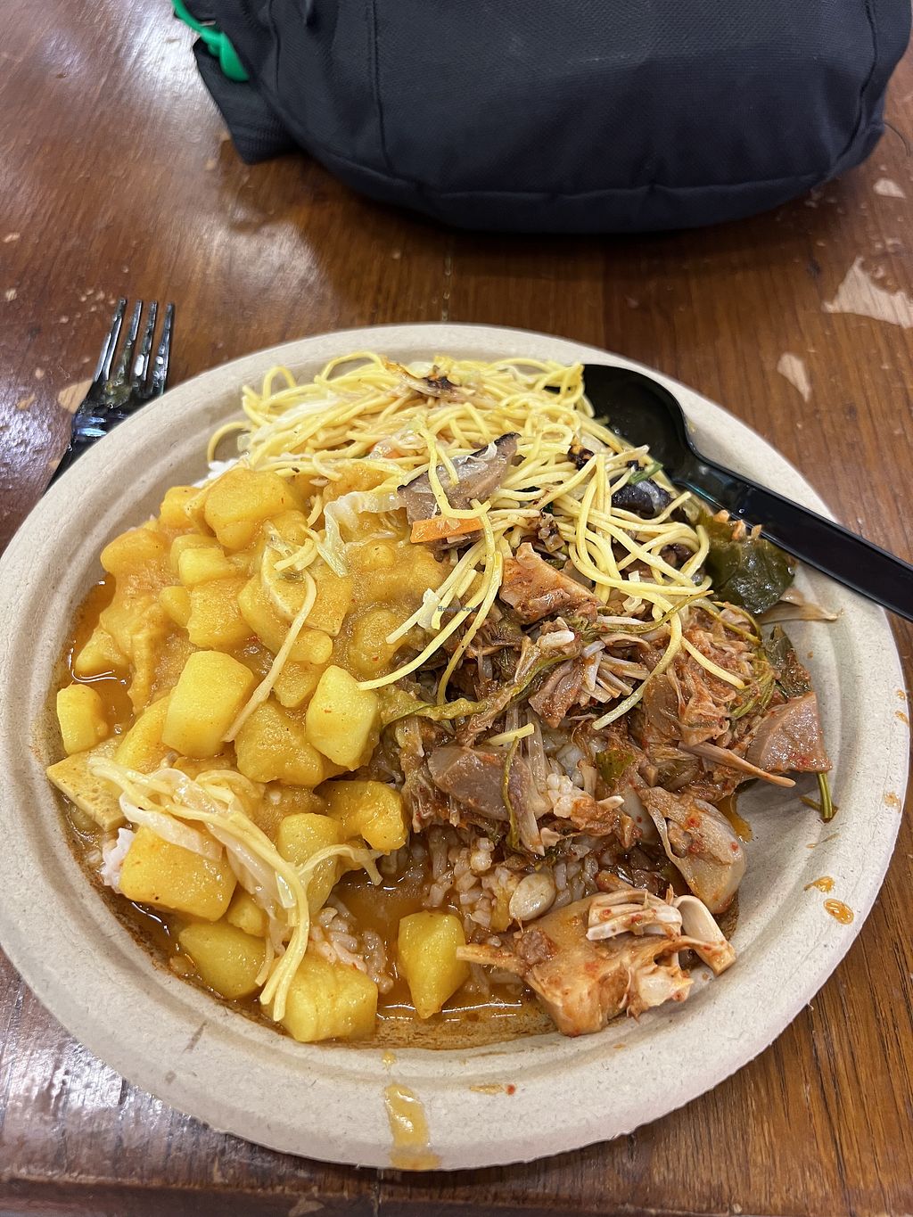 Lots of items to choose from. I got rice with 3 which included vegetable noodles, potato curry and a mushroom & jackfruit stew for 55 baht. Nice options but was a bit bland. Stalls also sells individual items such as northern sausage around the corner from where the silver trays are.
