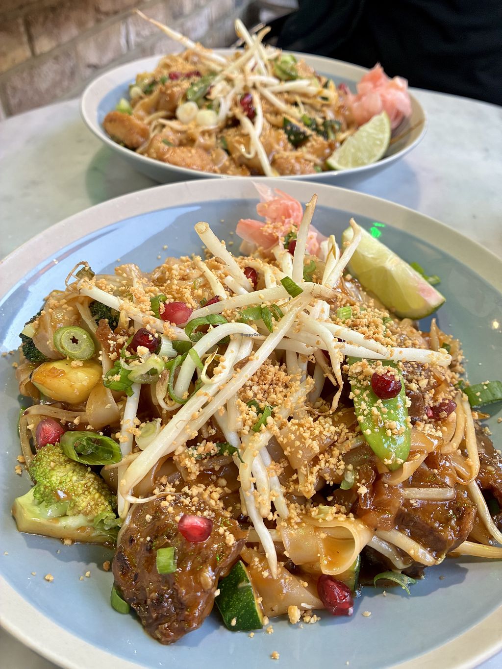Pad Thai mit „Lamm“ im Vorder- und mit „Hähnchen“ im Hintergrund.