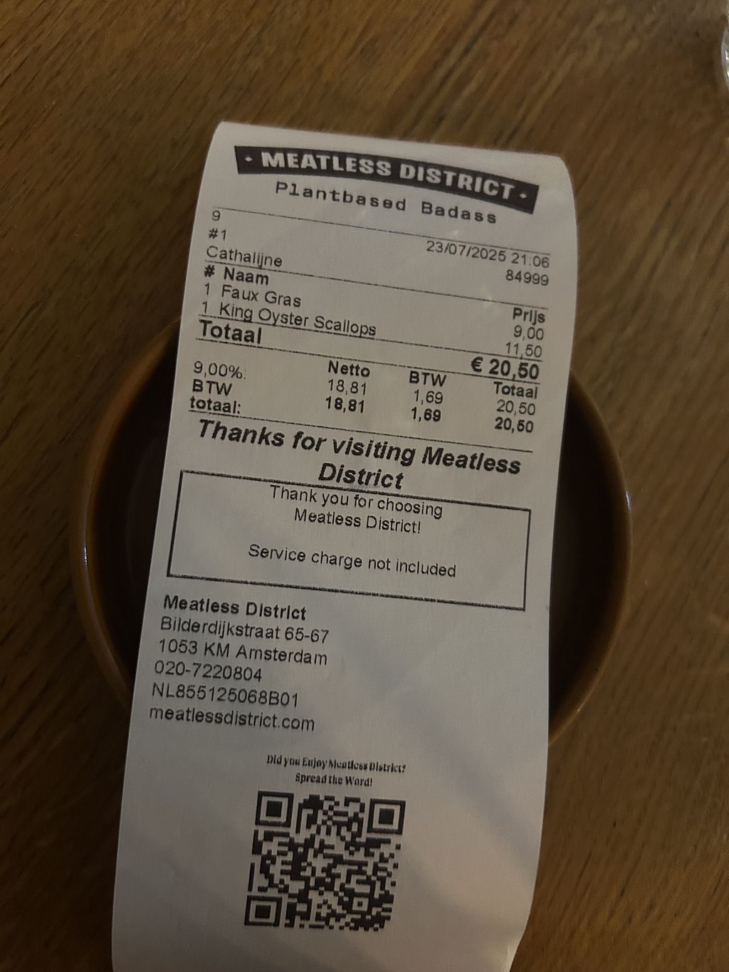 Our first vegan restaurant in Amsterdam coming from USA. The selection and freshness of appetizers, entrees and desserts, unique ingredients, preparation and taste are all splendid. Portions are small but this is disclosed up front, and prices are very reasonable for this high quality of food. My wife and I are very glad we came here and highly recommend it to vegan and others who enjoy high quality plant based food.