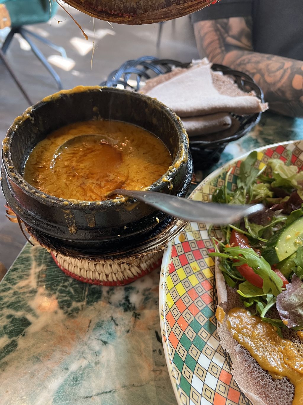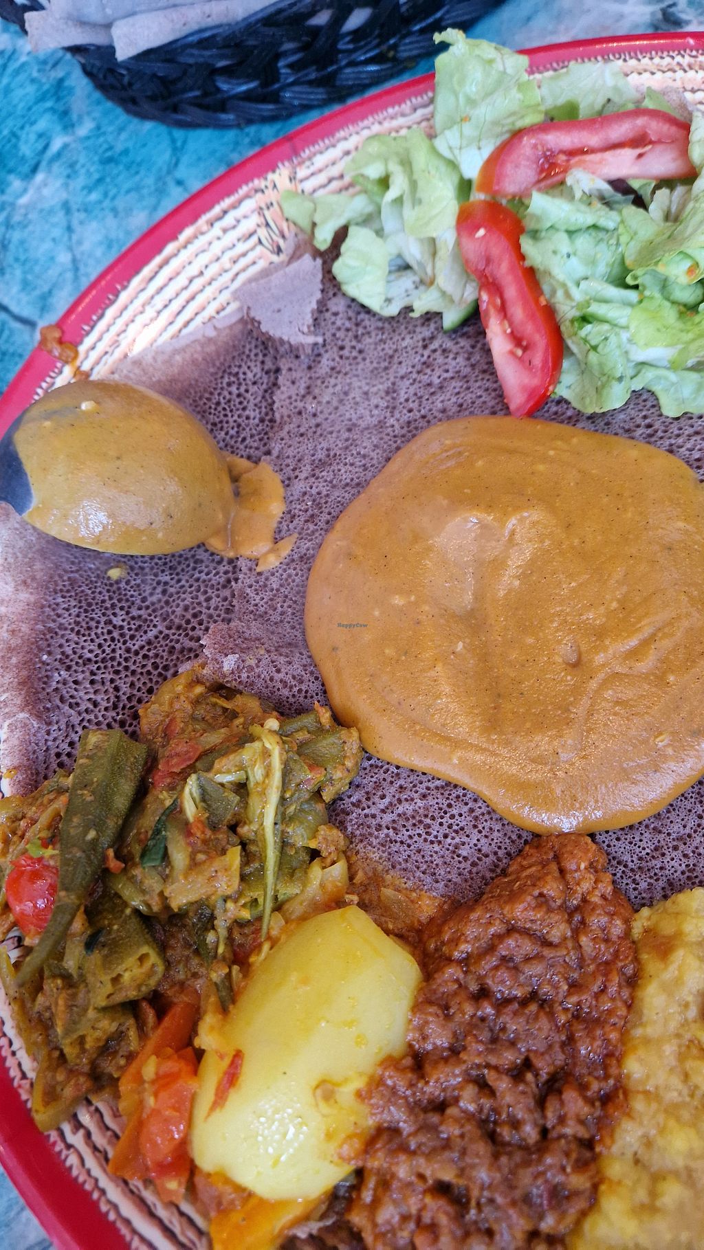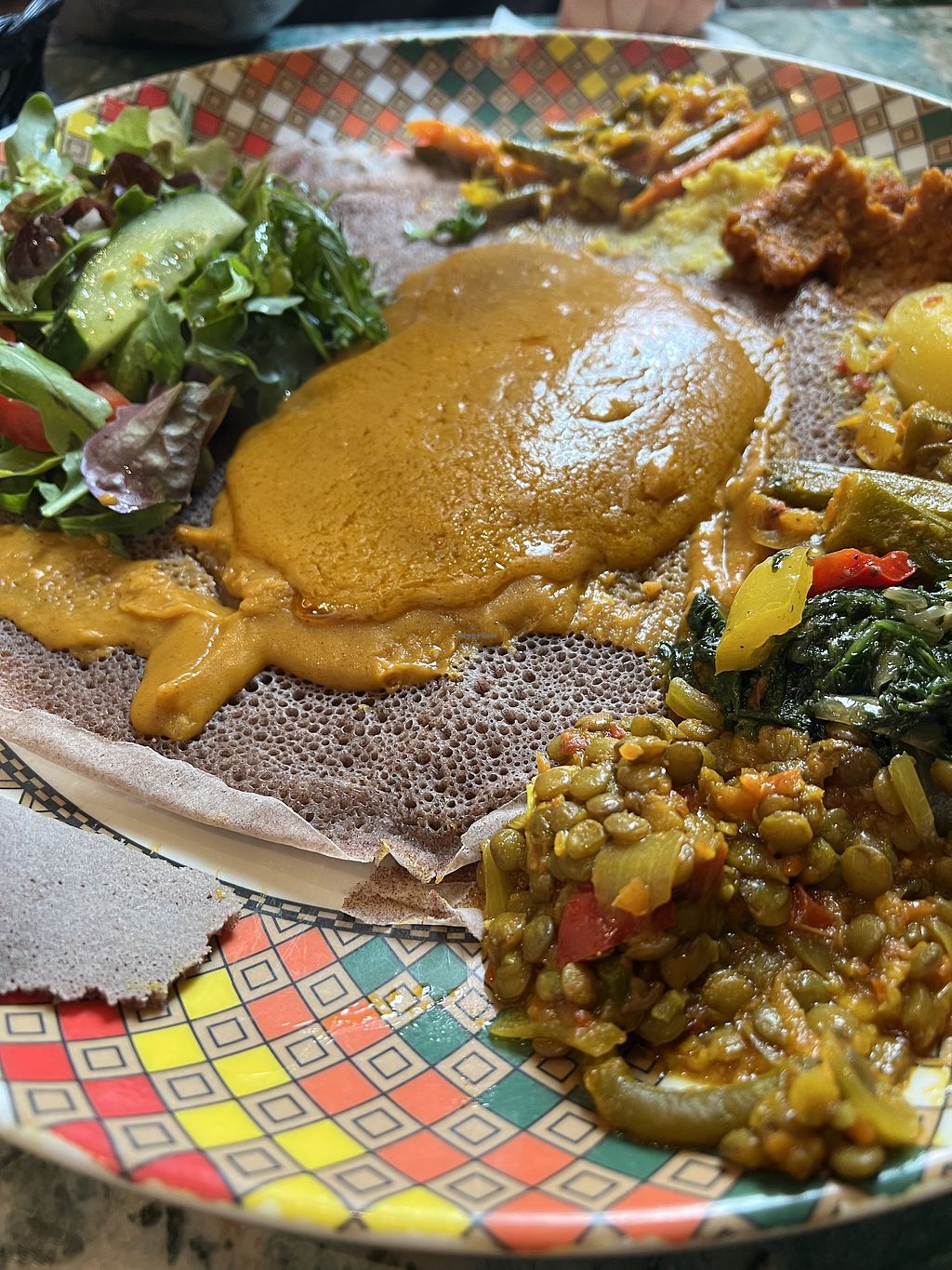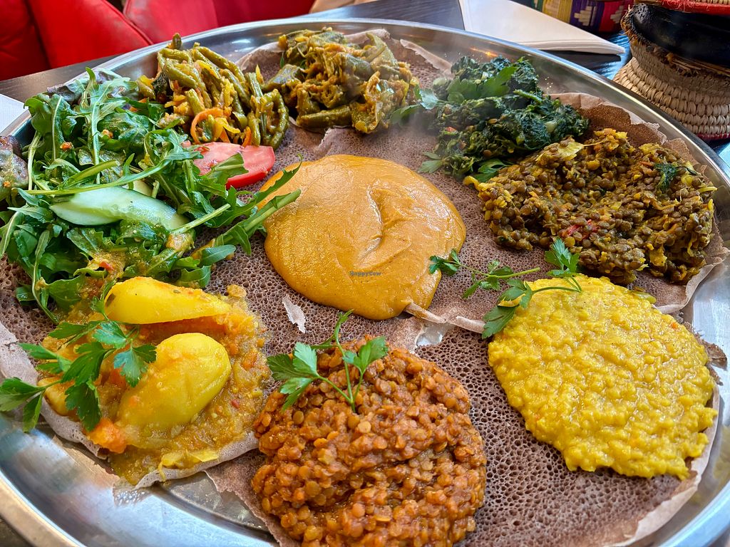 Very popular place, frequented by mostly countrymen, very cozy and familiar vibes, maybe a bit stuffy if you like spacey restaurants. We ordered the mixed vegetarian platter, which is also vegan, and it was soooooo good, every component was spot on, perfect spicyness, amazing fluffy injeera, loads of vegetables, and the chickpea stew was my personal highlight. Staff also gave us an Eritrean shot after our meal, which reminded me of Raki. Loved every minute of our visit here and can highly recommend this place!