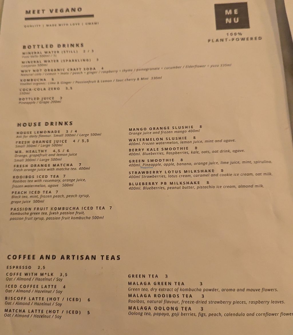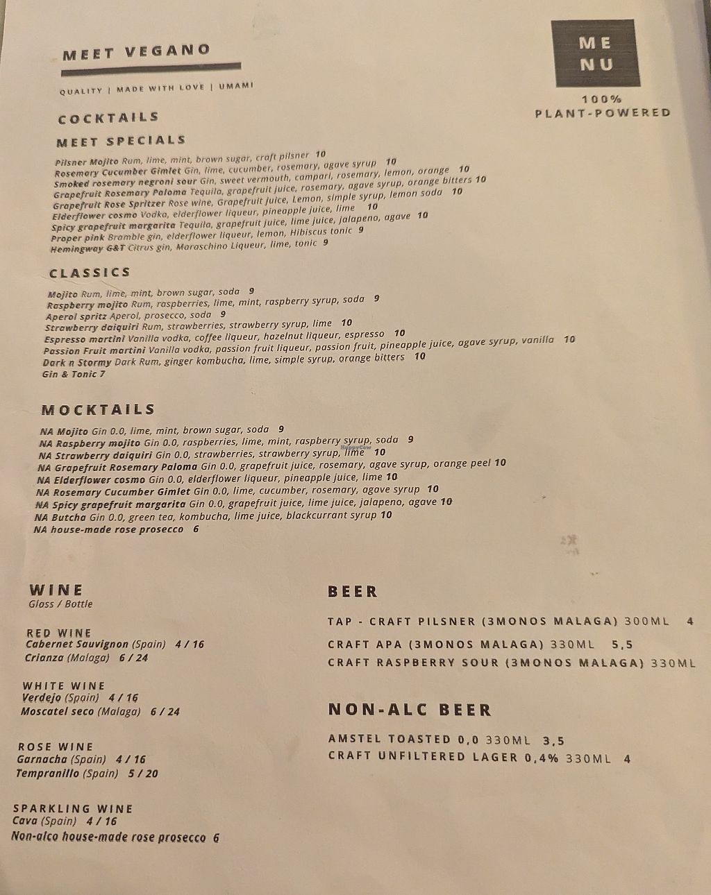 Genuinely interesting and trendy staff serving up fabulous plantbased food in this great city called Malaga. A dedicated vegan restaurant in the midst of meat loving Spain; daring to be different and appreciated by many. Long may this restaurant last! Great food choices to be made; dribble over the menu and choose wisely. Eat. Sleep. Repeat; Meet Vegano.
