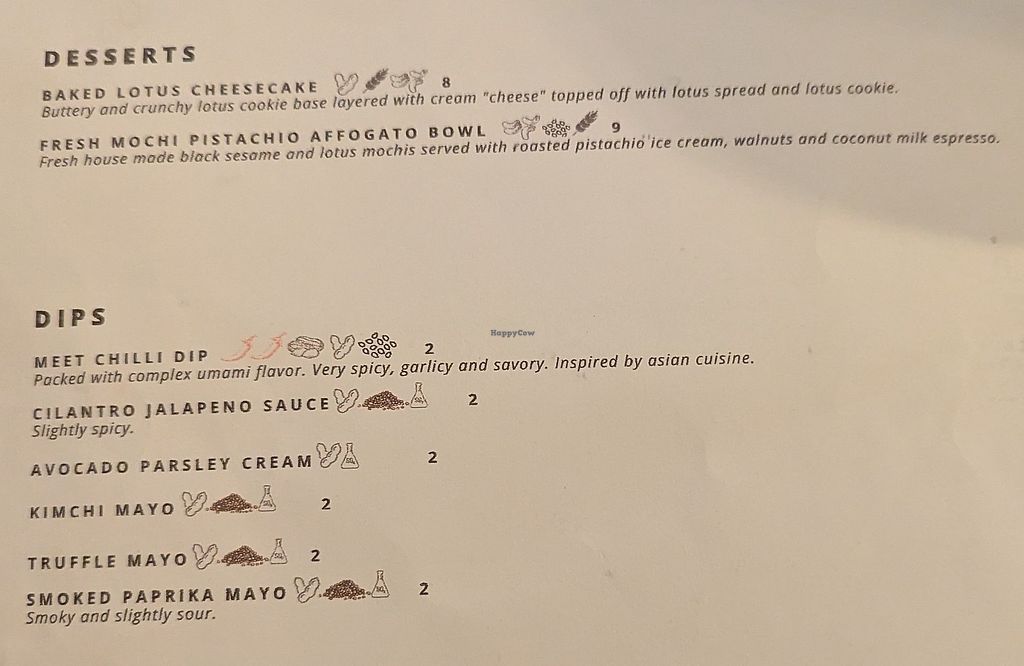 Excellent food with some interesting things on the quite broad menu. We had the upside down seitan salad which was delicious and the equally tasty holy burger. We also tried both desserts (Mochi and a Cheesecake), coffee and a milkshake, all very good. Worth the expense and the wait (which was long already, and then made worse by the trainee forgetting the milkshake and we had to wait an additional 15 mins for it).